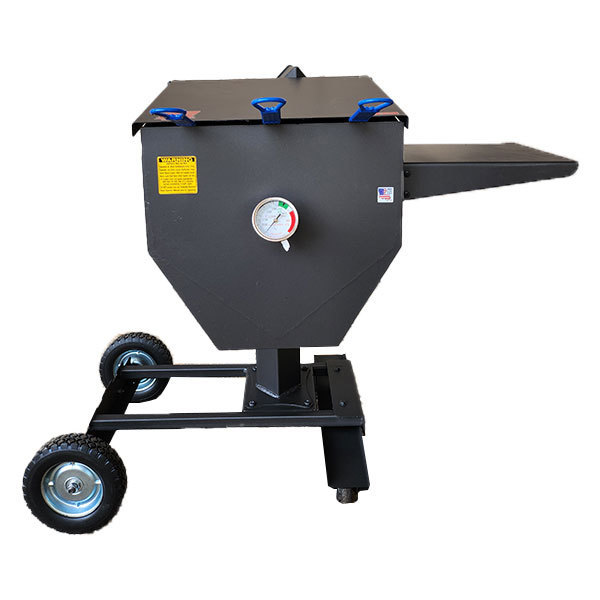 This Triple Basket Fryer by R&V Works is the perfect fryer for backyard fish fry or to serve french fries, onion rings, appetizers to go along with your BBQ. This fryer is also capable of cooking for your large parties or commercial events. Combining approximately 8 1/2 Gallons of oil with 90,000 BTU of heat potential, this portable deep fryer has the power to keep up with the demand of your patio cookouts, tailgating parties and medium to large fish fries of 65 to 70 people per hour. Also being a multi Basket Fryer, you are able to fry different foods at the same time. This fryer is also perfect to fry up to two 14 lb. Turkeys. All of R&V Works fryer works with the Burner Flue Hovering in the cooking vat, positioned so that the excess breading and/or batter will fall to the bottom of the fryer where the oil is cooler. This prevents the oil from being scorched by the sediments laying directly in the heating zone which will very quickly ruin the quality of your cooking oil. This results in a 70% reduction in oil usage when compared to other deep frying systems. The Fryer also features a built in 2 1/2″ thermometer making it easy to monitor the oils temperature. The fryer features 8″ solid rubber wheels and a front axle with castors making this fryer easy to move. Made from solid carbon steel with a high temp charcoal gray finish, this fryer will withstand many years of use. This fryer is set up for liquid propane and is for outdoor use only!