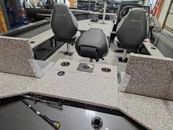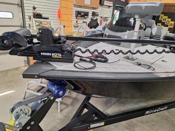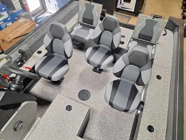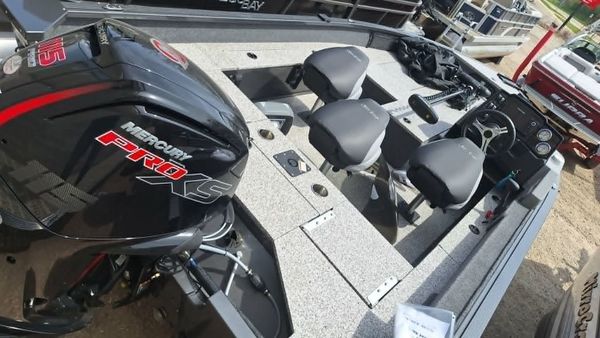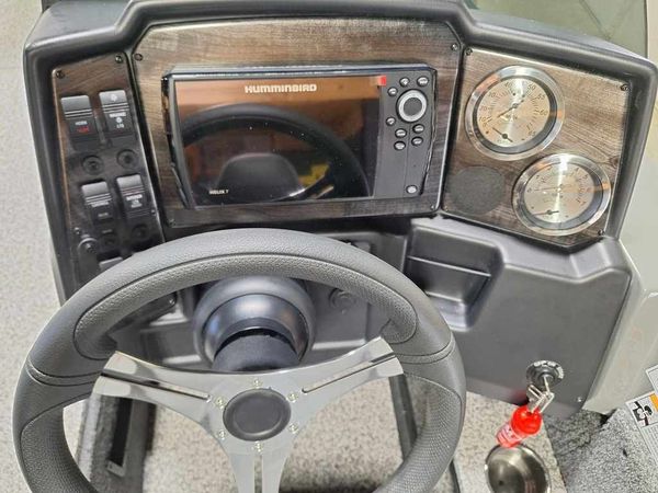 VINYL PRO PACK JENSEN AM/FM/MP3 W/2 SPEAKERS BUTT SEAT ROD STORAGE FLIP UP CLEAT BATTERY CHARGER BOARDING LADDER MINNKOTA TERROVA 80 HUMMINBIRD HELIX 7 DEPTHFINDER RIGGED FOR MERCURY MOTOR KARVAN 2350# SWING TONGUE BUNK TRAILER RATCHET COVER