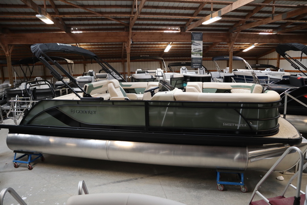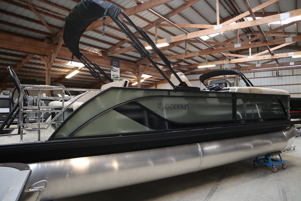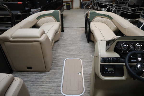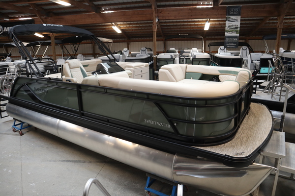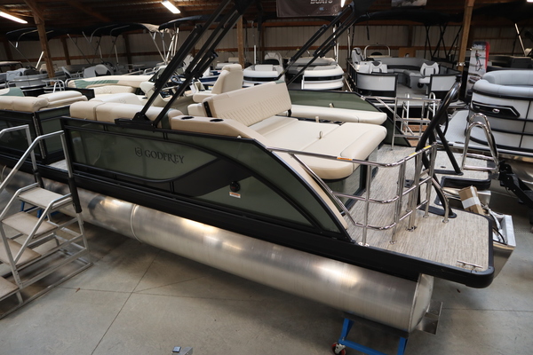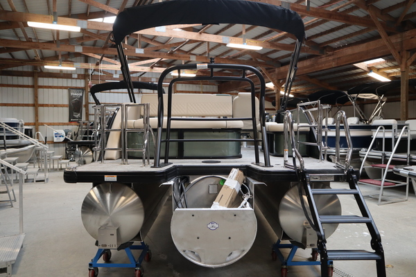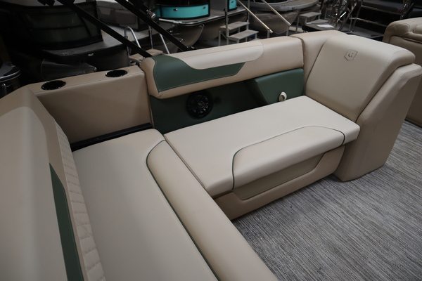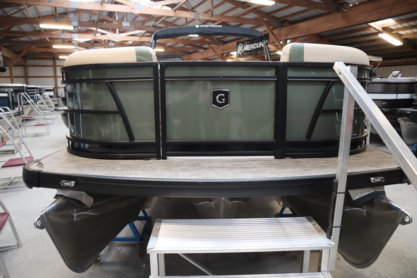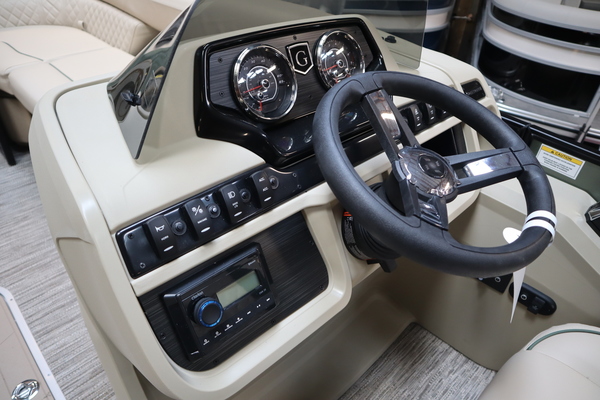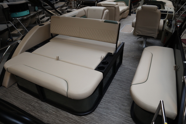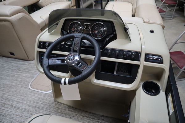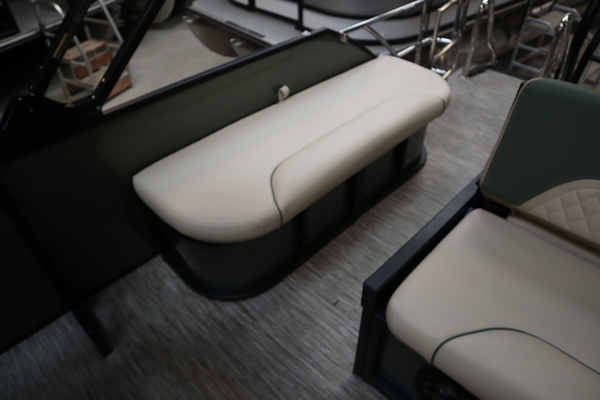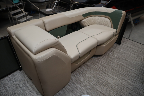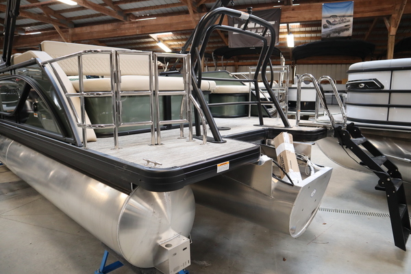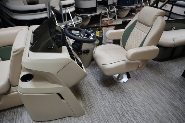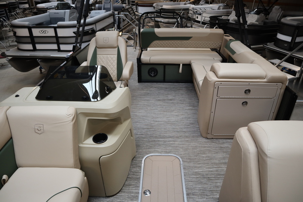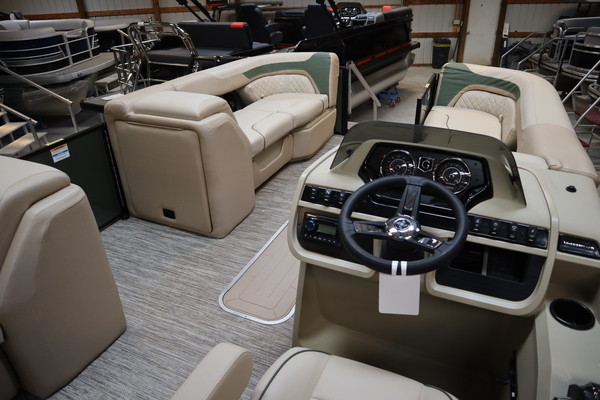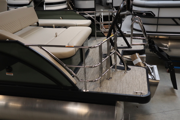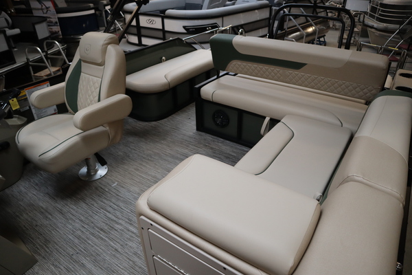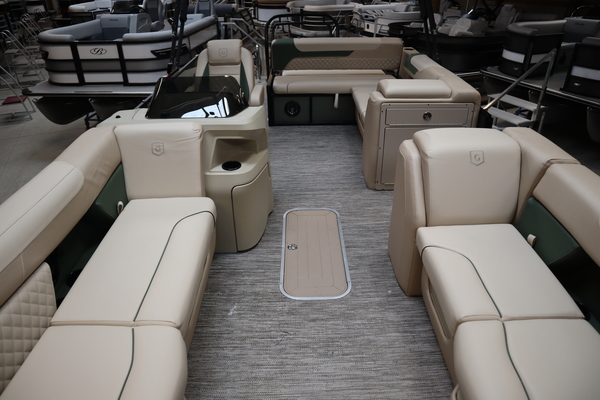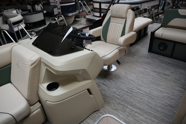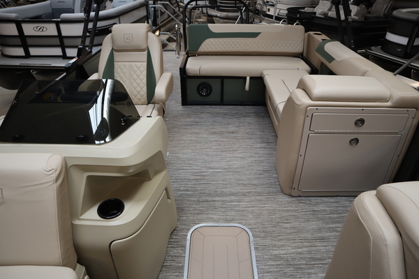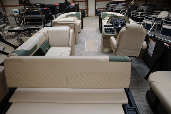 Price includes a Mercury 200 HP 4-stroke (NEW BUILT IN 2024 PROGRAM 25), Stainless Steel Prop, Tandem Axle trailer with Brakes and Center Log Kit, 27" iMPACT Center Tube Package (Two 25" outer tubes with 27" center tube; Under deck skin (full length); Inside Skirting; Lifting strakes; 45 gallon fuel tank; Multi-function GPS Gauges; Heavy Duty Channels), Extended Rear Deck, Midnight Package (Black Skirting w/ Bow Extension, Black Aluminum Rub Rail, Black Rail Insert, Black Rails, Black Canopy Frame, Black Corner Caps, Black Ladder), In-Floor Storage, Multi-function GPS gauges & LED docking lights, Ladder; Lillipad, Sea Star hydraulic with Tilt Wheel, Wireless Phone Charger - Charging Pad; 10W fast charging, Stainless barrier and gate, Stainless Steel Fixed Cleats, Standard Power Bimini top with protective boot and dome light (Black). round table w/ base, Captain?s Chair Upgrade with slider, reclining and fold down arms, Teak Isle; Tilt out Trash Can, Ultimate Ski Tow - Black, Clarion Color, CMM-20 head unit with LCD display, Bluetooth, AUX input, and (4) Speakers with Sport Black Grilles, USB-C charging ports: Additional USB-C Chargers throughout layout, Stern Toy Box, Color is Smooth Sage Panels with New Fast Back Black Rails, Graphics (Black Low Band Graphic), Upgraded Sienna Beige Vinyl Interior with Sage Accents, Quilted Accents and wrapped bases, Golden Weave Flooring, Snapless Playpen cover ? Black. Price includes dealer prep, freight and all factory rebates.