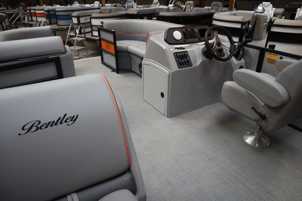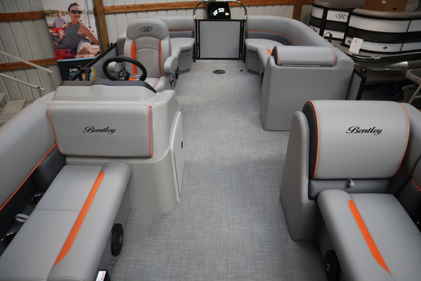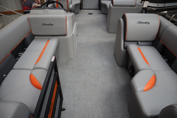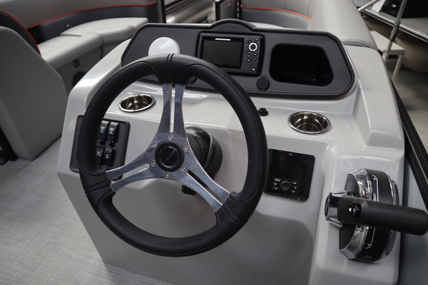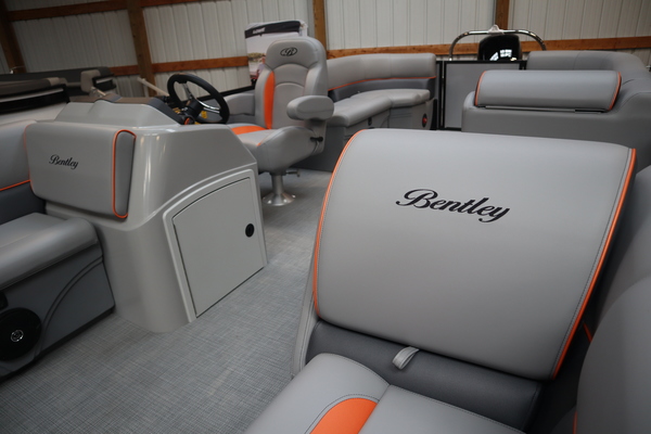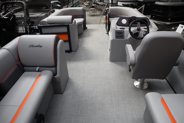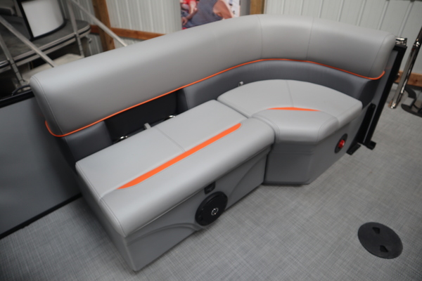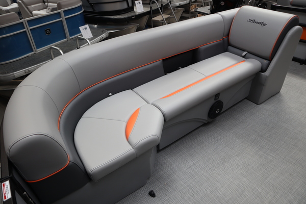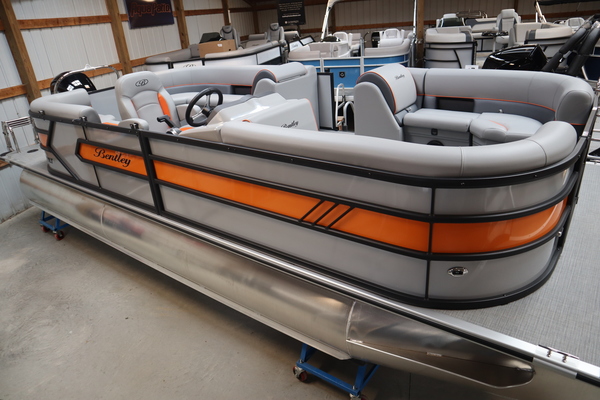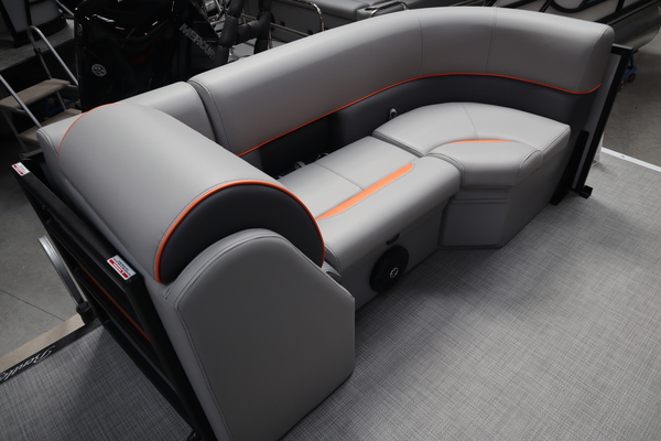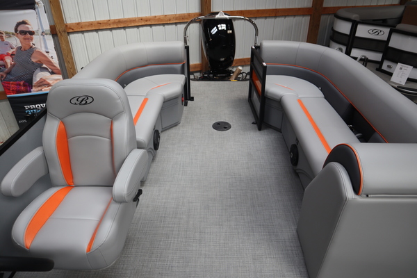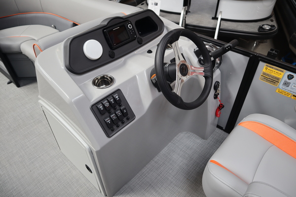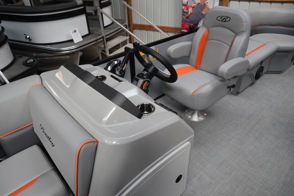 Price Includes a Mercury 150ELPT (Built in 2022), Stainless Steel Prop, Tandem Axle Trailer with Brakes, Hydraulic Steering with Tilt wheel, Sport3 Hull (3/4 Tube, Aluminum Underskin, 32 Gal Gas Tank and Lifting Strakes), Gray Seagrass Weave Flooring, Stereo System w/ 4 speakers, 12Volt Receptacle w/ Dual USB Charging Ports, Custom Fiberglass console with windshield, Helix 5 and Multi-gauge, Led Docking Lights and LED Navigation Lights, Battery Cut off Switch with one battery, Manual Bimini Top with Quick Disconnects, Roto cast Furniture bases with SE Gray vinyl Interior with Blue Accents, Mid-Back Captain's Chair, Bolt Ski Tow Bar, SS telescoping ladder, and Black Playpen Cover. Color is Silver Panel with Orange Accent, Textured Black (Powder Coat) Rails, Gray Interior with Orange Accents and Seagrass Flooring. Price includes dealer prep and freight.