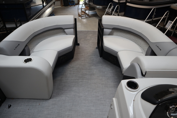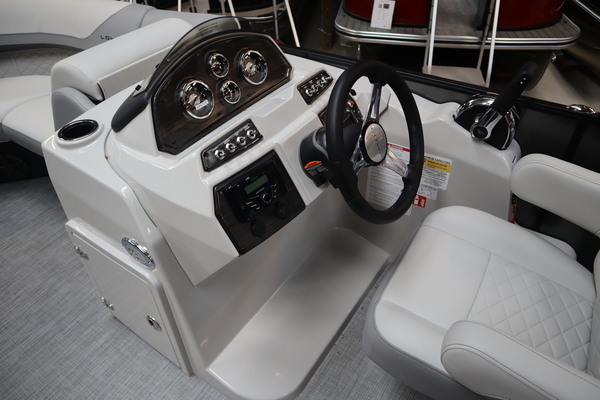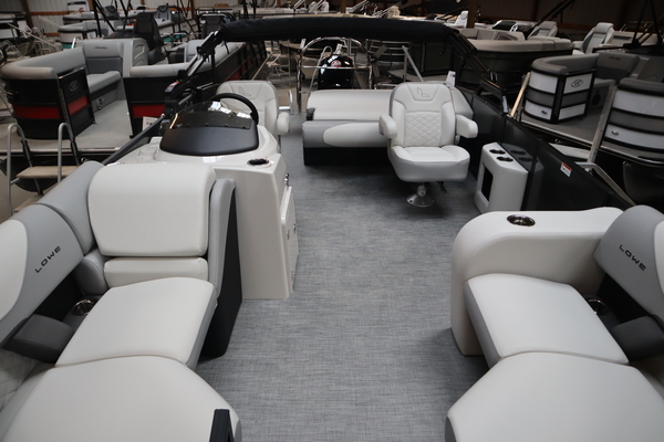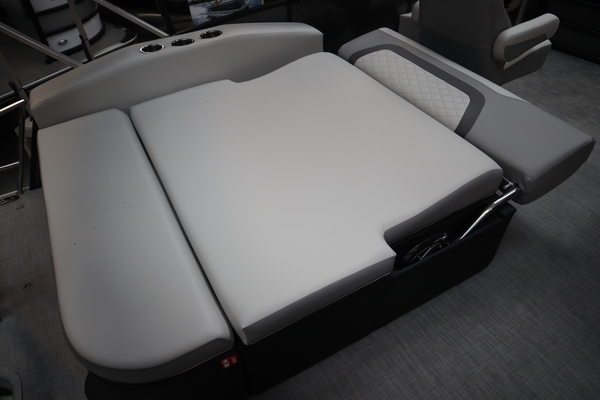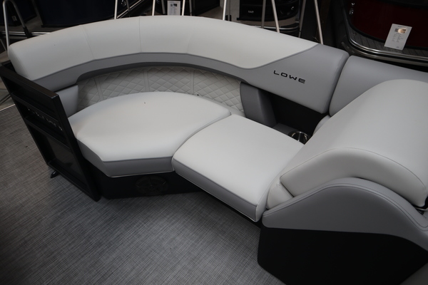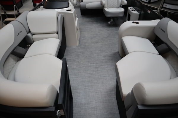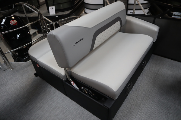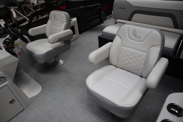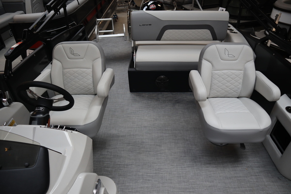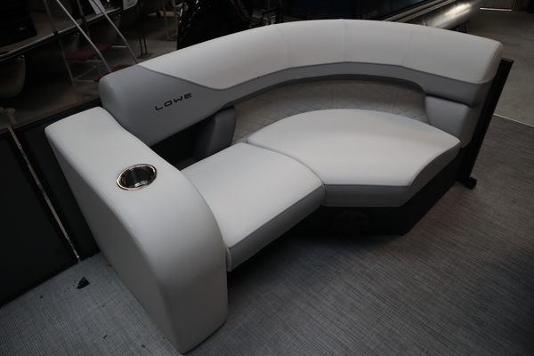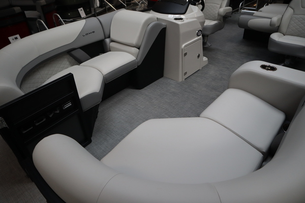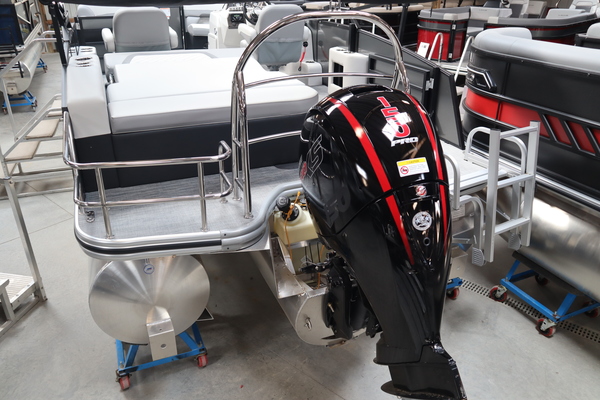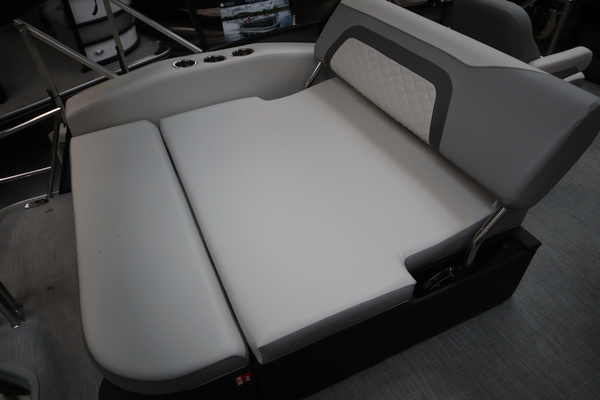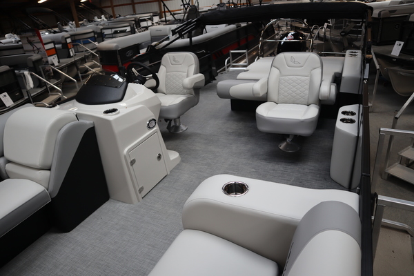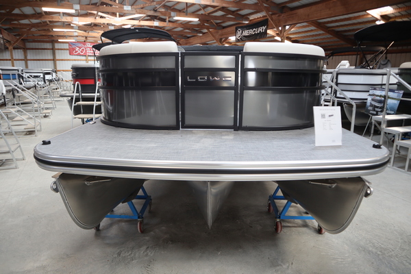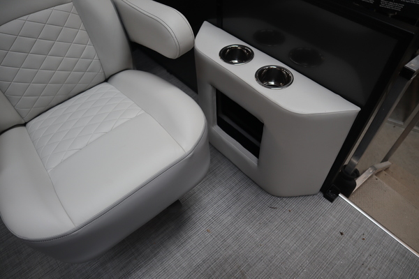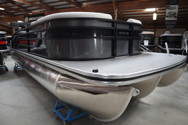 Price Includes a Mercury 150hp Pro XS 4-stroke, Stainless Steel Prop, Tandem-Axle Trailer with Brakes and Center Log Kik, Triple Tube Package (Three Toons, Lifting Strakes, Aluminum Underskin), Hydraulic Steering, Kicker KMC45 Stereo w/ 4 Speakers. Deluxe Gray Floor, Helm & Passenger seats w/ folding armrests, Mid Ship Cupholder, Storable Table with Cupholders, Rear Conversion Bench, Port Fixed Fence, Black Factory Cover & Power Bimini Top w/Boot & Quick Disconnects, Ski Tow & Dual Battery Bank System with 1 Battery. Price Includes Dealer Prep and Freight. Color is Charcoal Fence with Black Graphic, Black Rails and Bimini Top Frame, DLX Gray Flooring & Gray Monochrome Furniture.