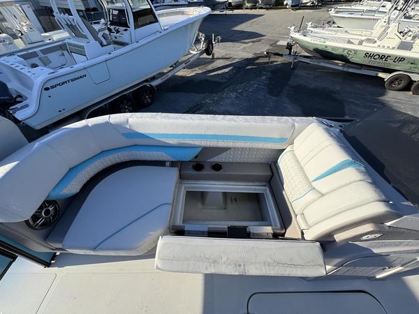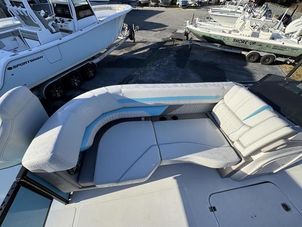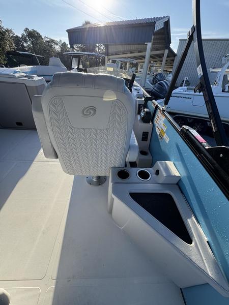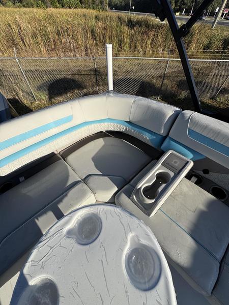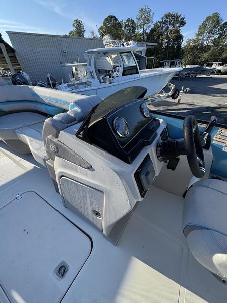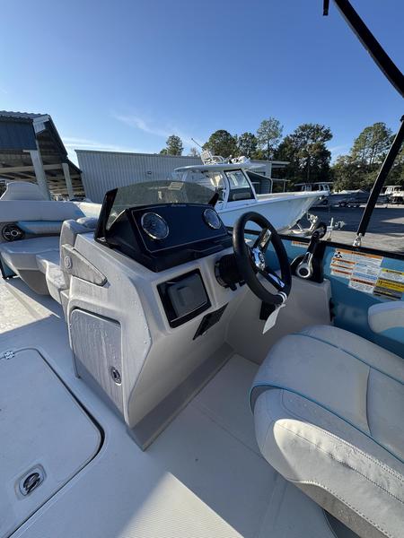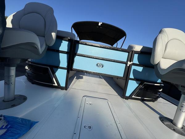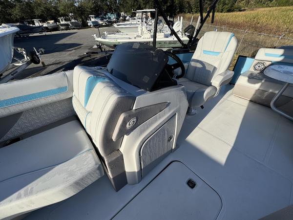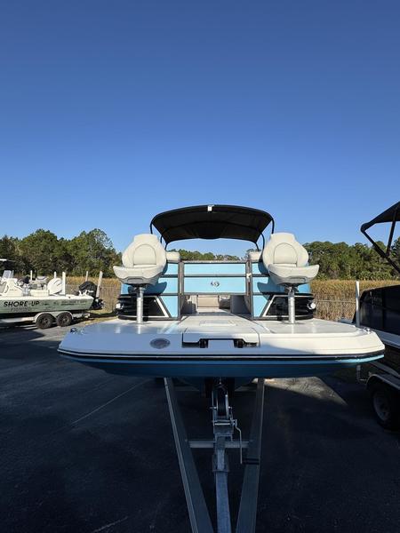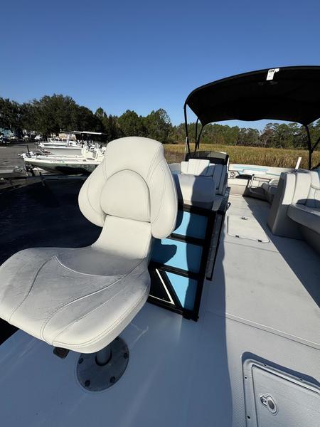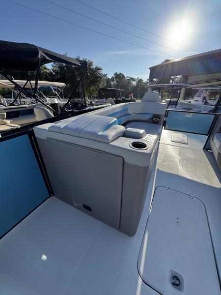 Premium Comfort: Enjoy the shade with an electric power canopy, relax in the deluxe reclining/swiveling captain and co-captain chairs, and cruise with the Clarion 4-speaker audio system.