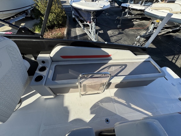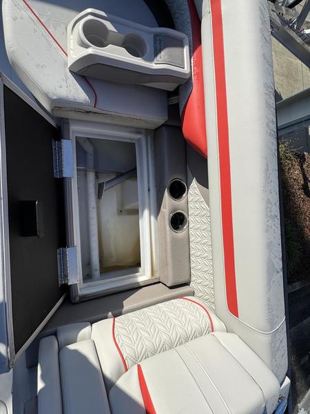 Fishing-ready features including livewell with pump, two fish seats, and trolling motor harness