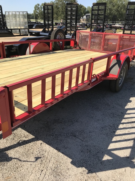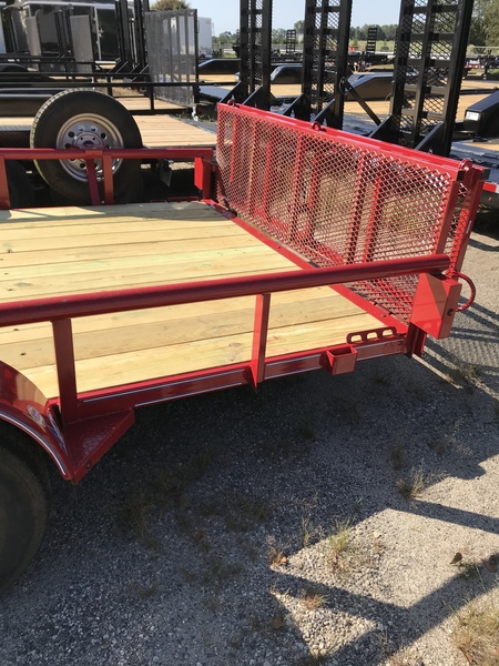 83x14 Diamond C, 3500# axle, 15" tires, bifold gate, pipe top rail, flip jack, side load ramps, spare tire included