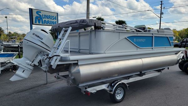 True Blue, show stopper pontoon ? Brand NEW! 2026 Godfrey Marine Sweetwater SW2086BF (bow fish model) powered by Yamaha 90hp 4-stroke (F90LB2) Ya?ll this motor is WHITE! The pontoon will be on a Magic Tilt trailer. This gorgeous pontoon will come with the following factory added options: dual battery switch, trolling motor harness kit w. plug & half gate, graphics ? mid body ? lagoon, LED docking lights, Baystar hydraulic steering w. tilt wheel, and a windscreen.