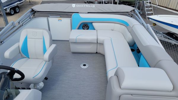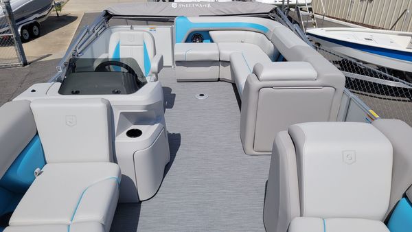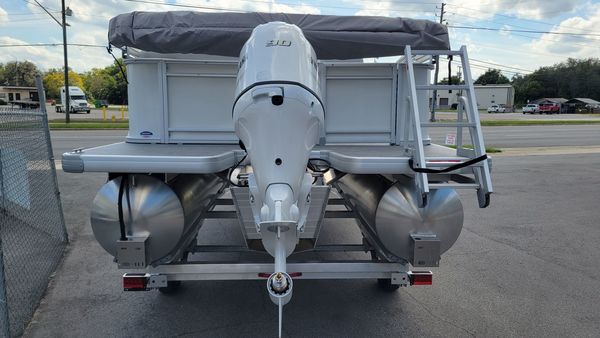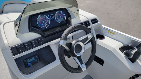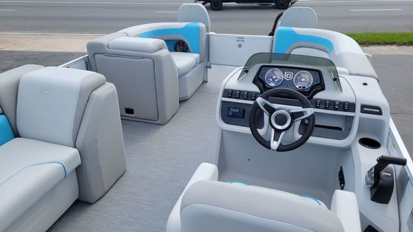 Standard options that everyone loves: boat cover, larger outer toons (25?), EZ climb boarding ladder, fixed cleats, a round table, the helm station that includes: cooler storage; cup holders, speedometer, tachometer, hour meter, fuel gauge, voltmeter, USB-C, and 12 volt outlet, and last but not least a crowd pleaser the Clarion Bluetooth stereo!!