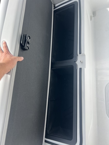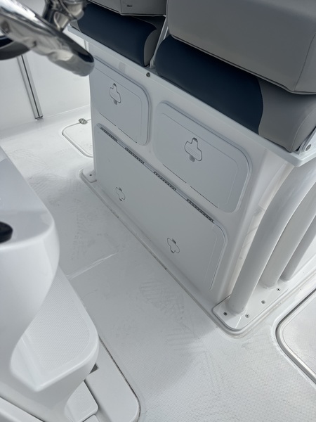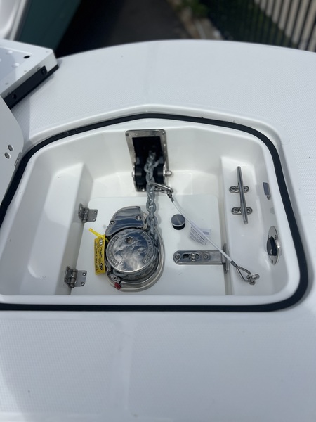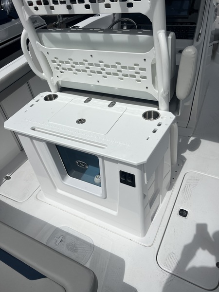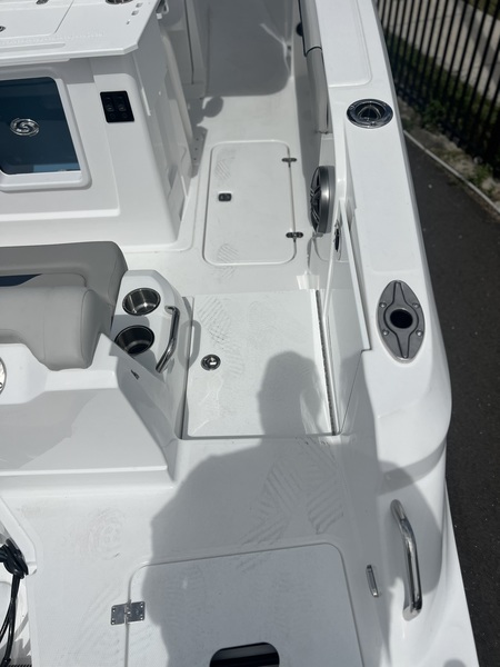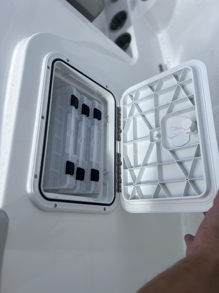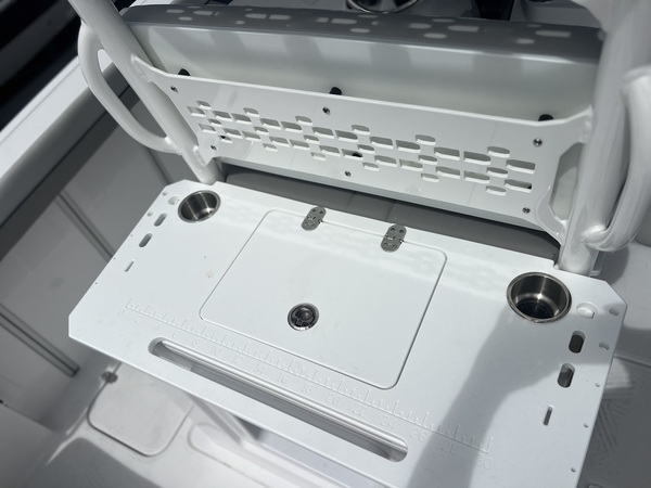 FISHING PACKAGE: TROLLING MOTOR HARNESS W/ PLUG & QUICK RELEASE BRACKET, ROCKET LAUNCHERS IN SOFT/T-TOP, BOW TABLE /CASTING DECK WITH SUN LOUNGE CUSHION, MIDSHIP STORAGE WITH 6 ADDITIONAL TACKLE BOXES, FISH BOX, SS CLEATS WITH ROD HOLDERS AND SS ROD.