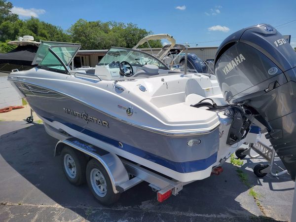 2024 NauticStar 203DC, Yamaha 150hp 4-stroke, and Magic Tilt aluminum trailer. The boat includes hull color-upper, hull color-accent, transom shower w. pressurized galley, fishing package, boat cover, and stainless steel prop.