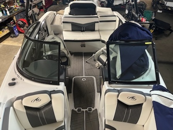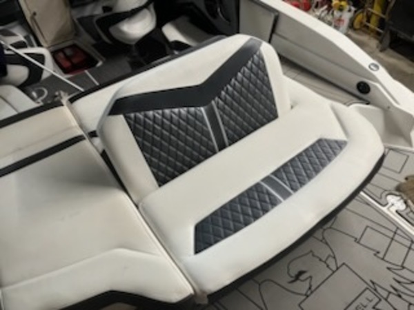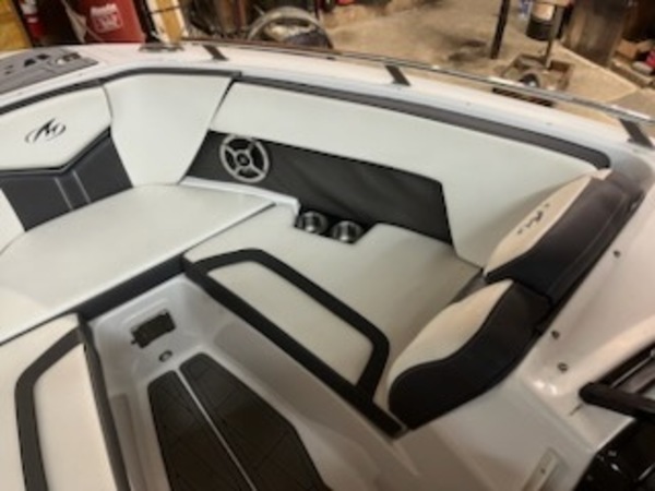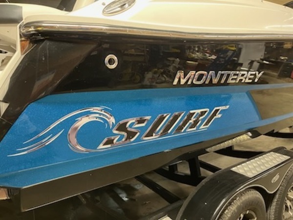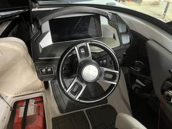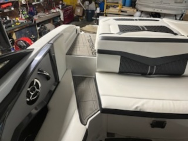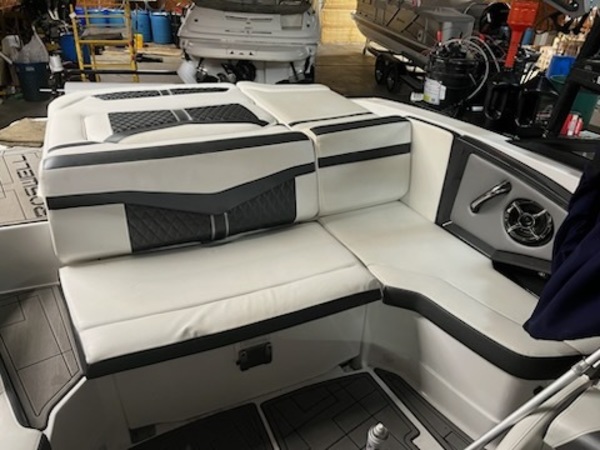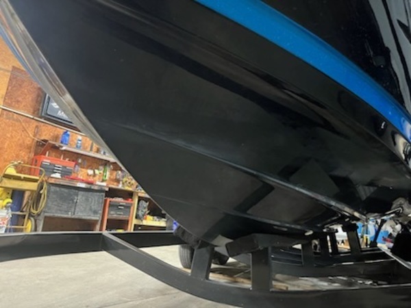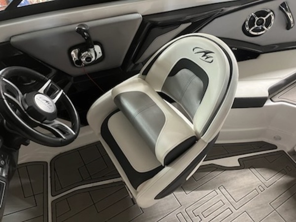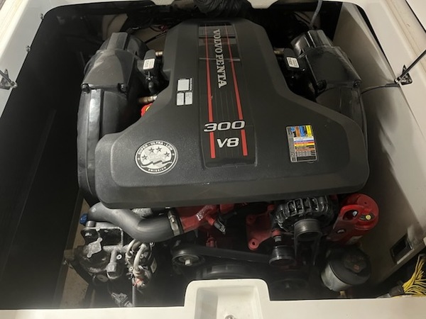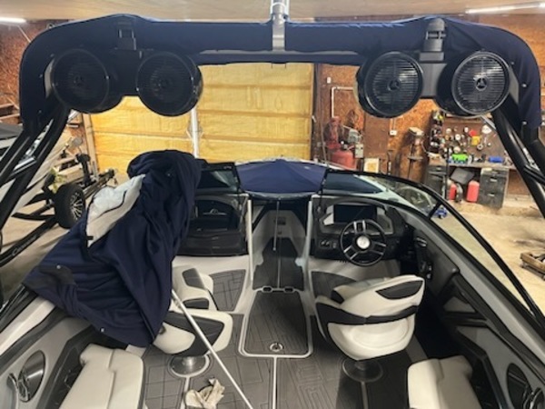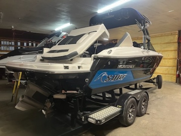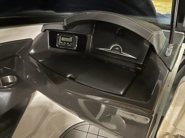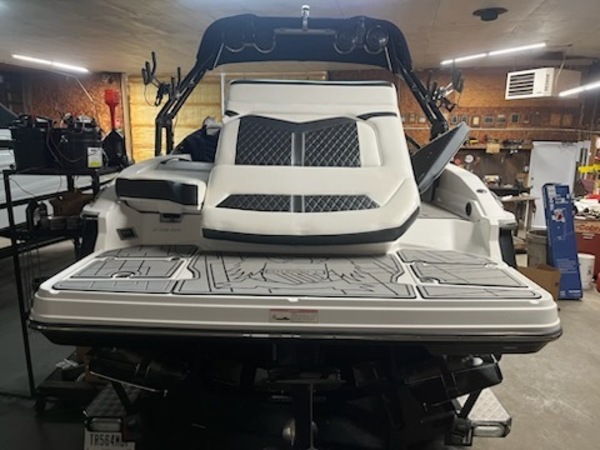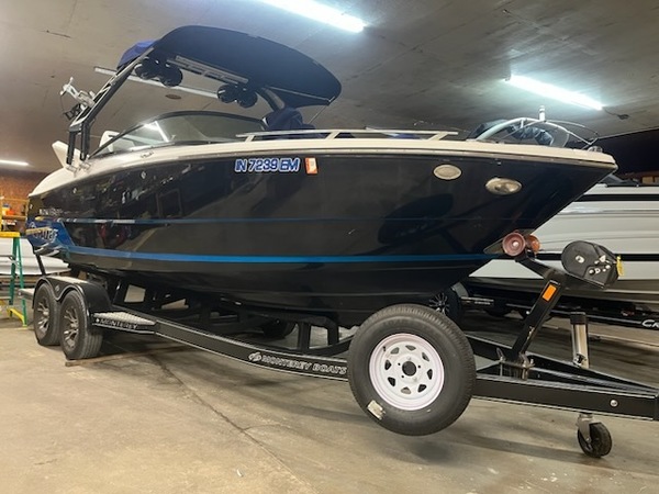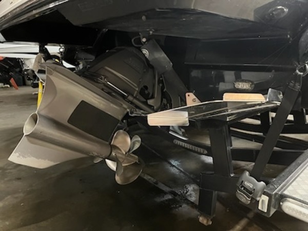 Beautiful Black hull sides with blue accents. 300 HP Volvo forward facing duo prop with only 235 hours. Wake tower with board racks and speakers, marine mat flooring throughout, massive trim tabs, ballast system and an oversized swim platform. This is the limited edition Roswell package. Tandem axle trailer included.