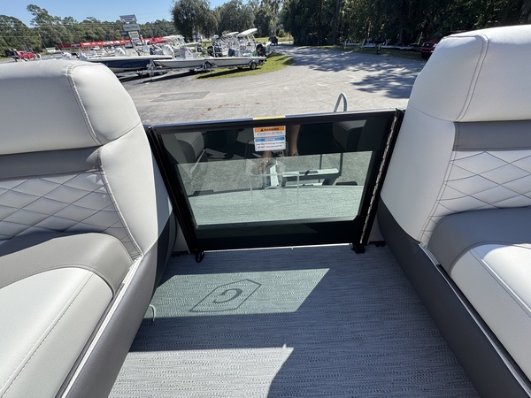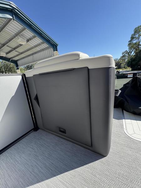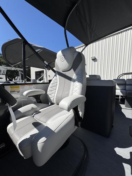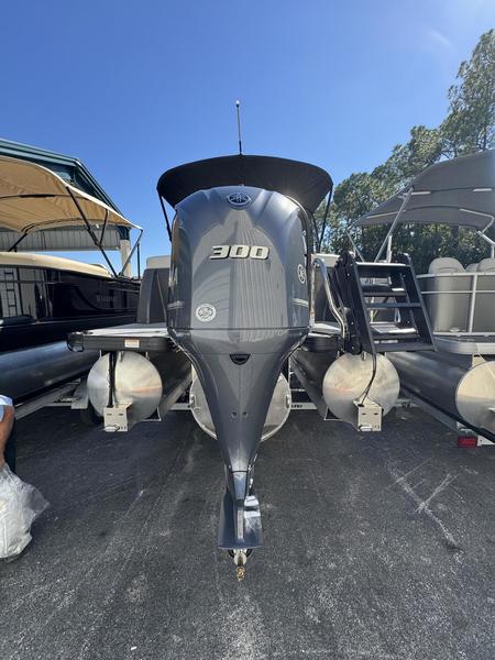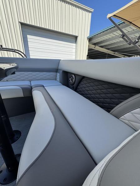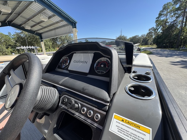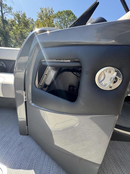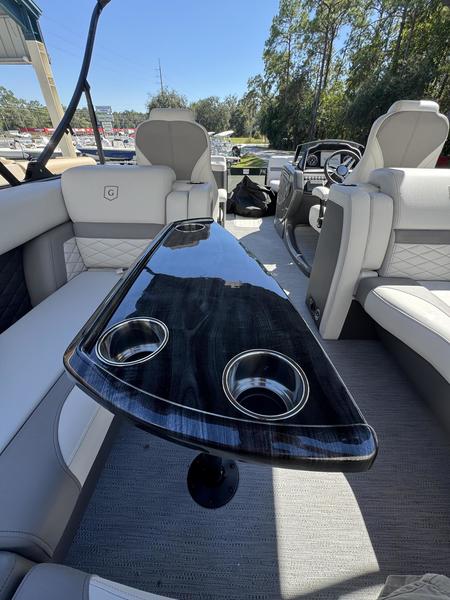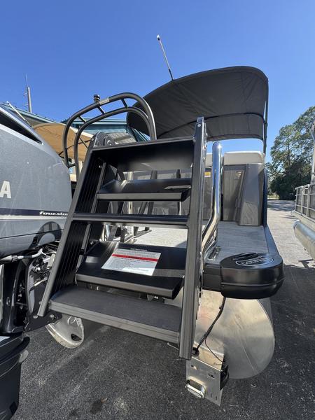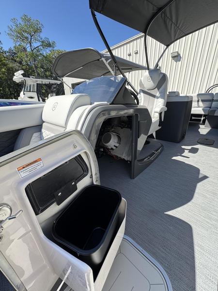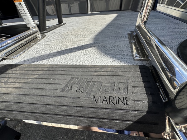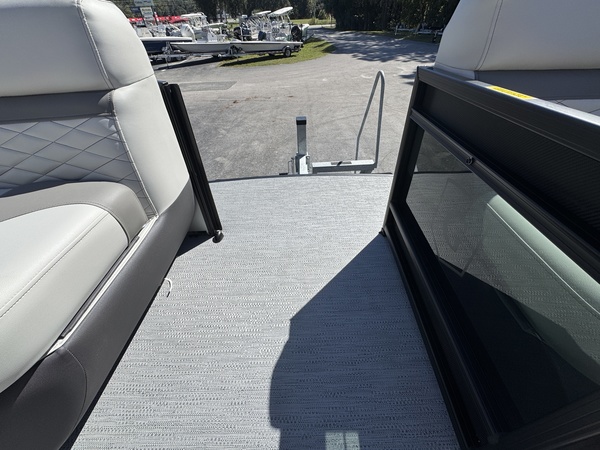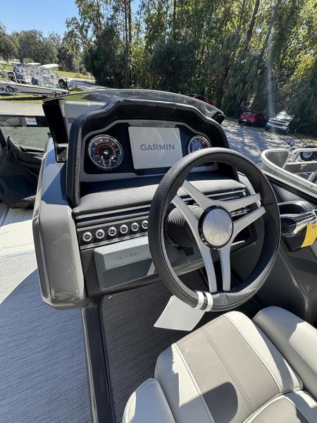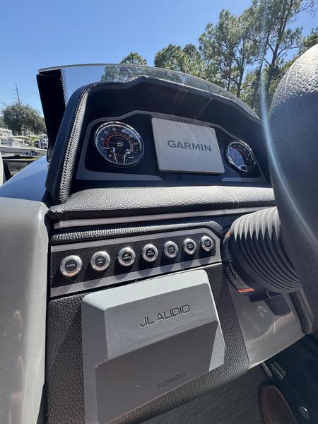 Elevated helm platform, upgraded helm station features (e.g., large touchscreen chartplotter/fish-finder, tilt steering wheel). Blacked-out rails, accent graphics, LED lighting, and LilyPad ladder for easy water access.