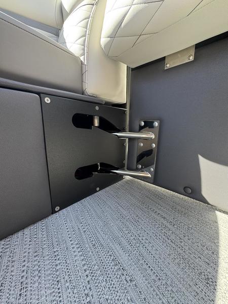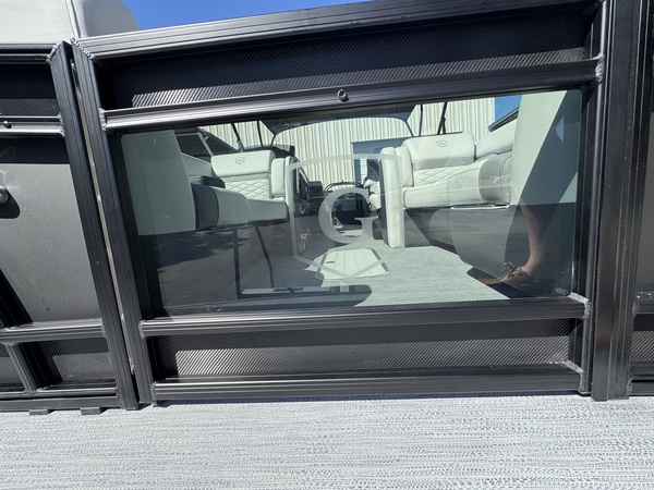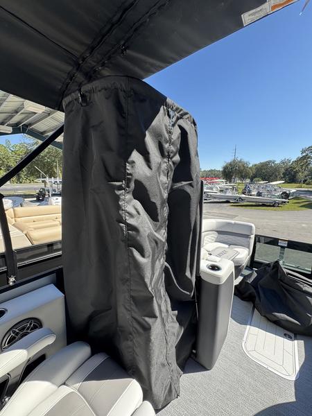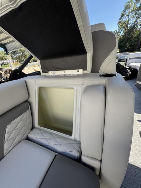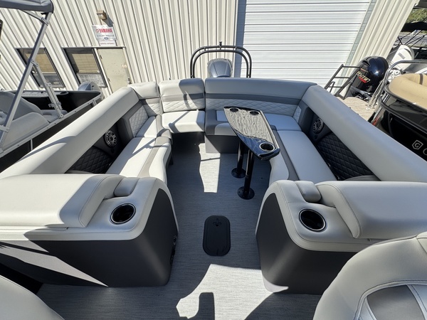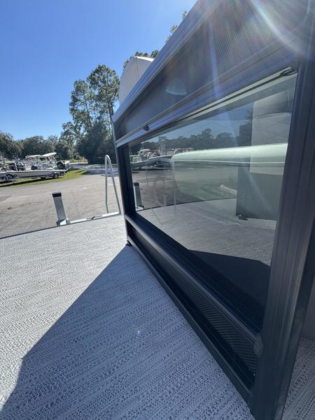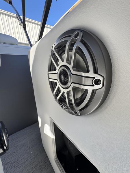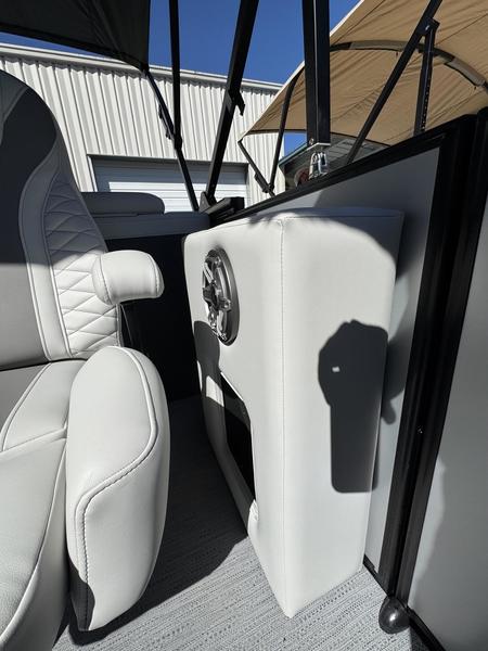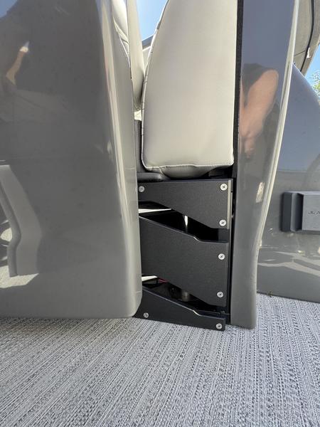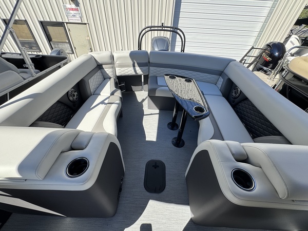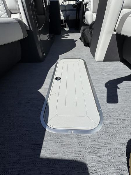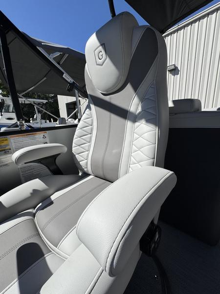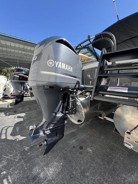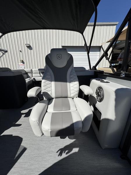 Elevated helm platform, upgraded helm station features (e.g., large touchscreen chartplotter/fish-finder, tilt steering wheel). Blacked-out rails, accent graphics, LED lighting, and LilyPad ladder for easy water access.
