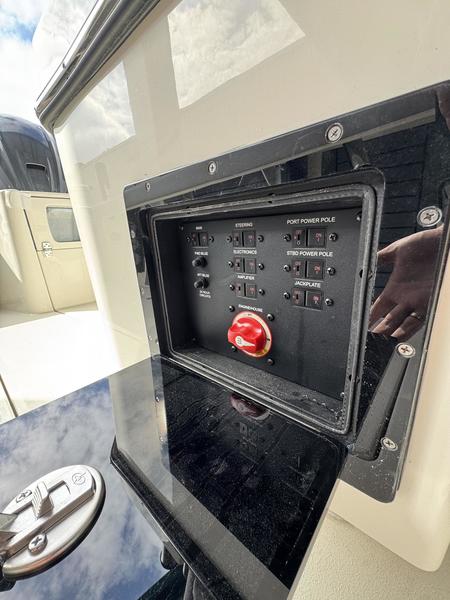 Premium Helm Station: Ergonomic console with space for twin MFDs, integrated switch panels, and optional head compartment.