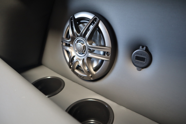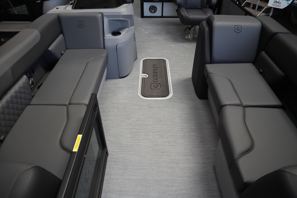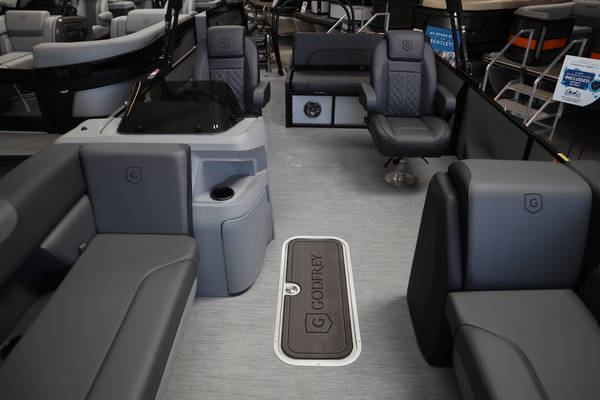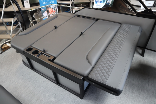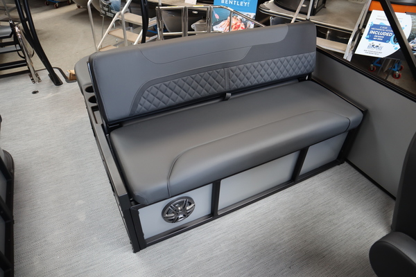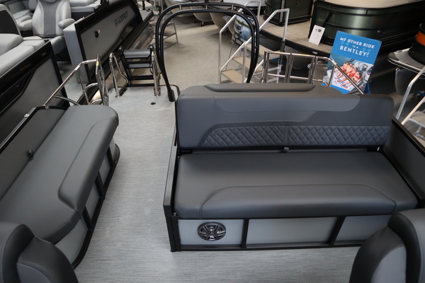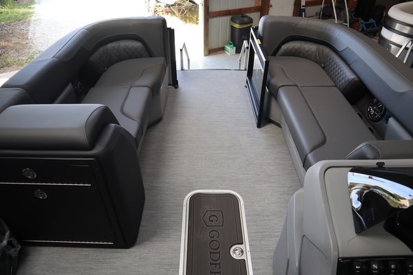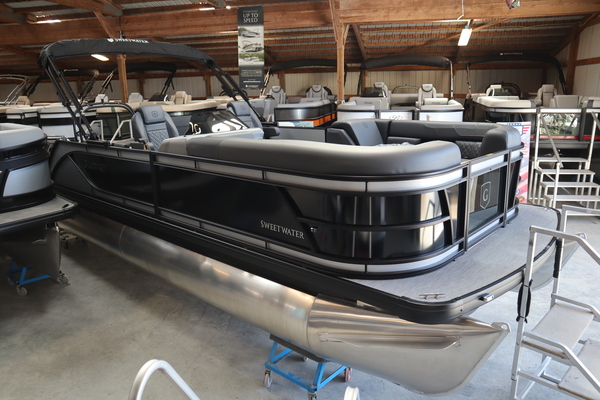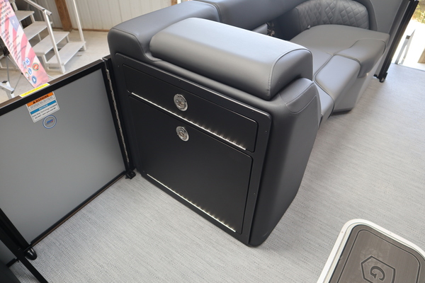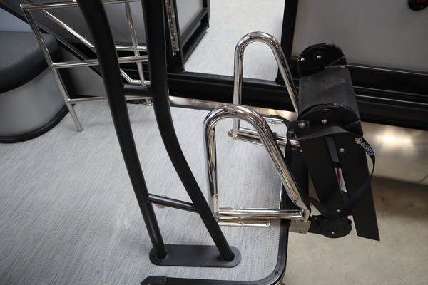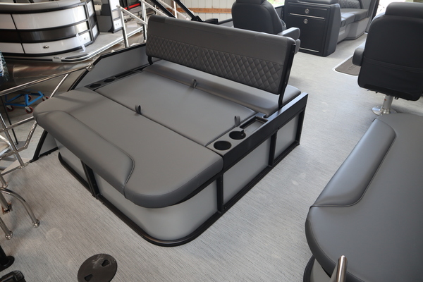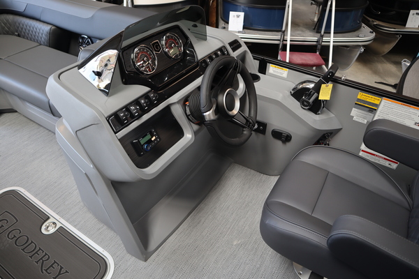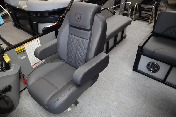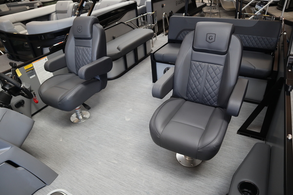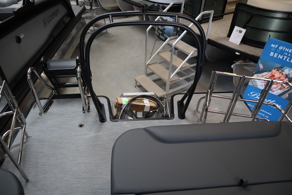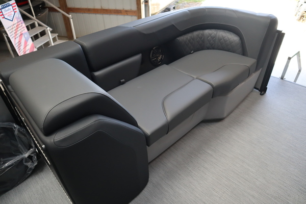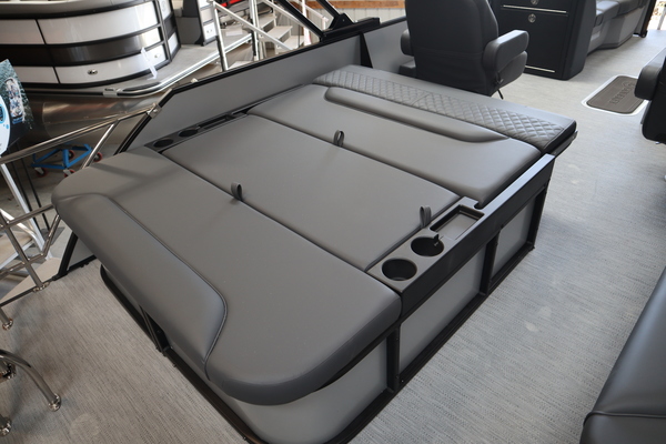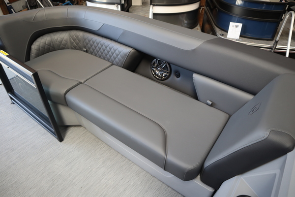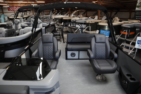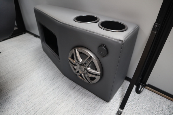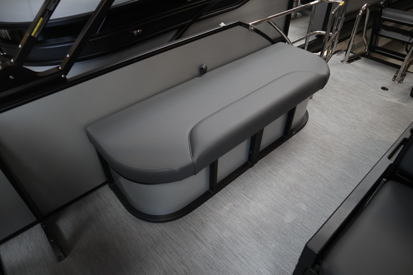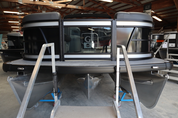 Price includes a Mercury 200XL, Stainless Steel Prop, Tandem Axle trailer with Brakes and Center Log Kit 27" iMPACT Center Tube Package (Two 25" outer tubes with 27" center tube; Under deck skin (full length); Inside Skirting; Lifting strakes; 45 gallon fuel tank; Multi-function GPS Gauges; Heavy Duty Channels), Midnight Package (Black Skirting w/ Bow Extension, Black Aluminum Rub Rail, Black Rails, Black Canopy Frame, Black Corner Caps), Extended Rear Deck, LED docking lights, Lilipad Ladder, SeaView Bow Gate, Sea Star Hydraulic Steering with Tilt Wheel, Stainless Steel Fixed Cleats, In Floor Storage w/ Mat. Standard Power Bimini top with protective boot and dome light (Black) Teak Isle; Tilt Out Trash Can, Wireless Phone Charger - Charging Pad; 10W fast charging, Captain?s Chair & Co-Captain's Chair Upgrade with slider, reclining and fold down arms, USB-C charging ports: Additional USB-C Chargers throughout layout, Sport Black Ski Tow Bar, Stereo; Clarion Plus Stereo Package: CMM-10 head unit with LCD display, Bluetooth, 4x20W RMS output, and (4) Speakers with Gray Grilles