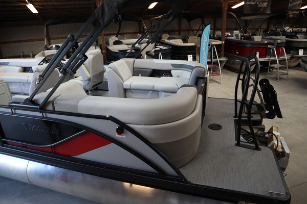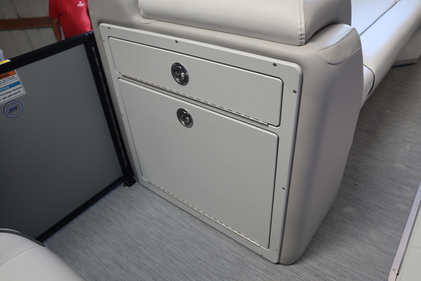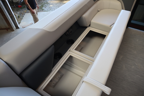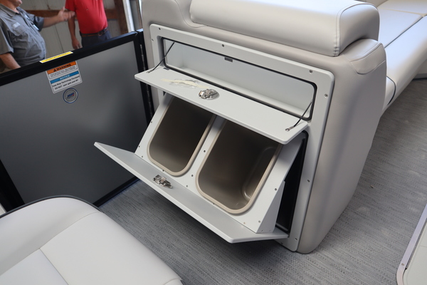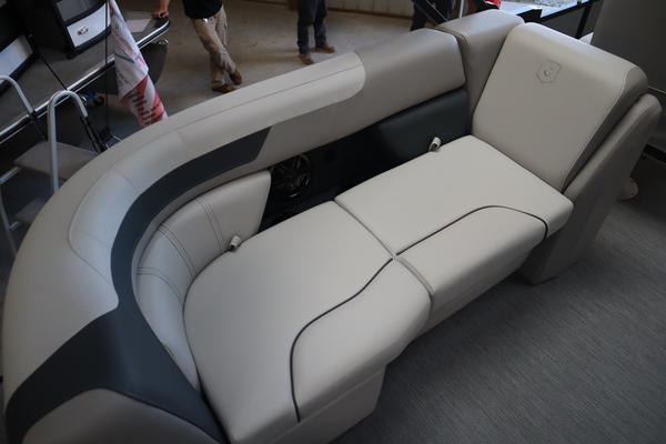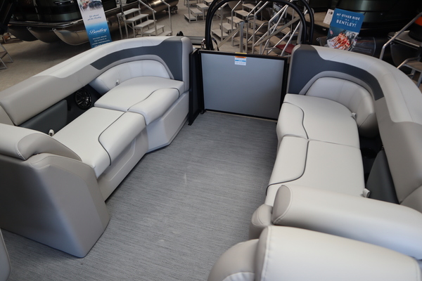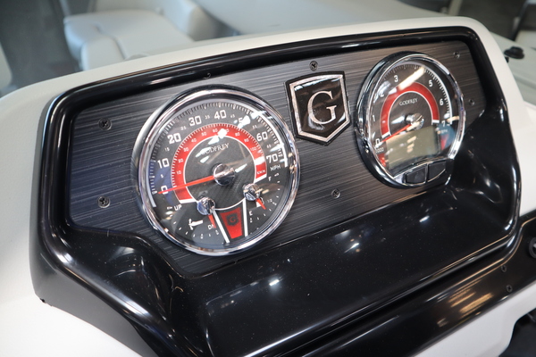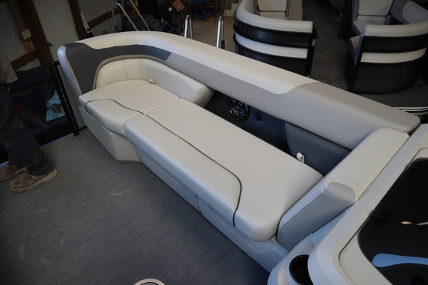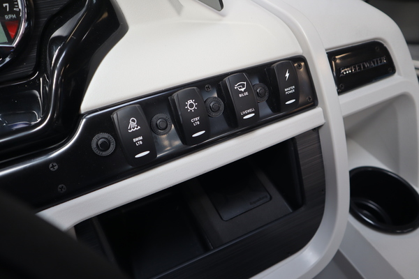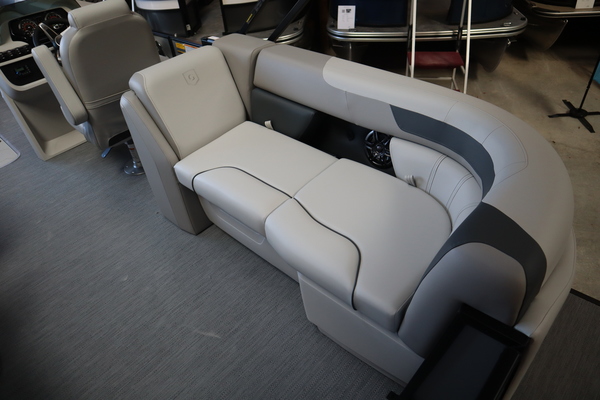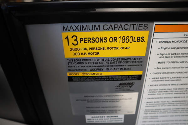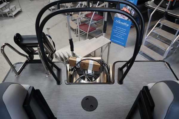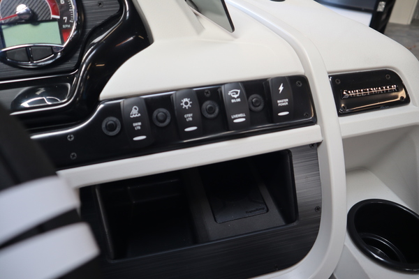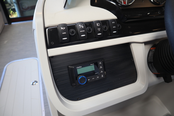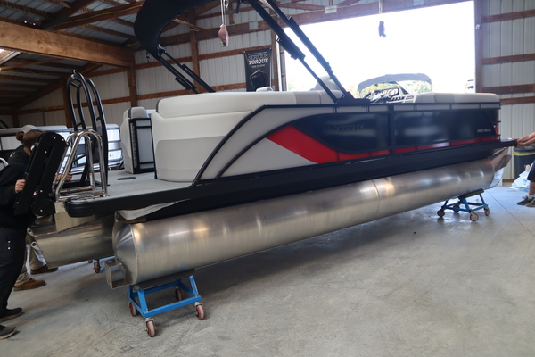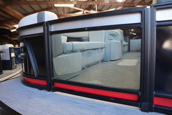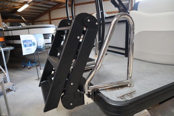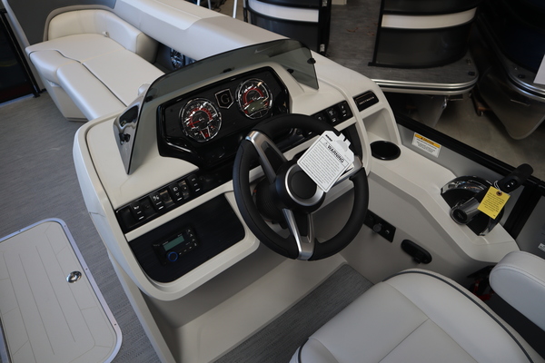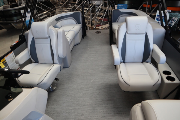 Price includes a Mercury 200XL, Stainless Steel Prop, Tandem Axle trailer with Brakes and Center Log Kit 27" iMPACT Center Tube Package (Two 25" outer tubes with 27" center tube; Under deck skin (full length); Inside Skirting; Lifting strakes; 45 gallon fuel tank; Multi-function GPS Gauges; Heavy Duty Channels), Midnight Package (Black Skirting w/ Bow Extension, Black Aluminum Rub Rail, Black Rails, Black Canopy Frame, Black Corner Caps), Extended Rear Deck, LED docking lights, Lilipad Ladder, SeaView Bow Gate, Sea Star Hydraulic Steering with Tilt Wheel, Stainless Steel Fixed Cleats, In Floor Storage w/ Mat. Standard Power Bimini top with protective boot and dome light (Black) Teak Isle; Tilt Out Trash Can, Wireless Phone Charger - Charging Pad; 10W fast charging, Captain?s Chair & Co-Captain's Chair Upgrade with slider, reclining and fold down arms, USB-C charging ports: Additional USB-C Chargers throughout layout, Sport Black Ski Tow Bar, Stereo; Clarion Plus Stereo Package: CMM-10 head unit with LCD display, Bluetooth, 4x20W RMS output, and (4) Speakers with Gray Grilles