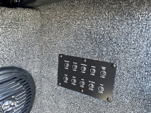 - Console, starboard, lit toggle switches, 2 drink holders, 12V power outlet, throw tray & MP3 cubby