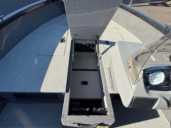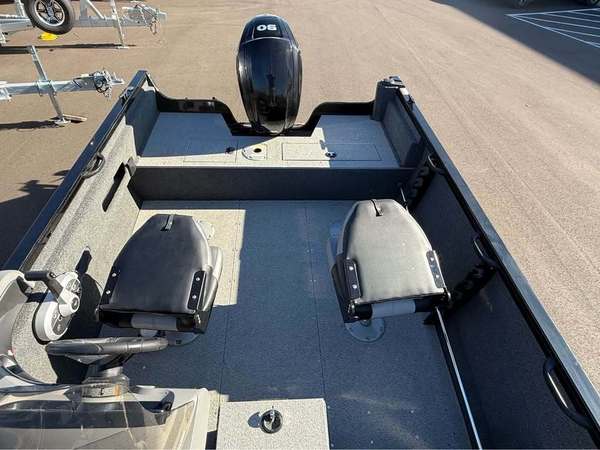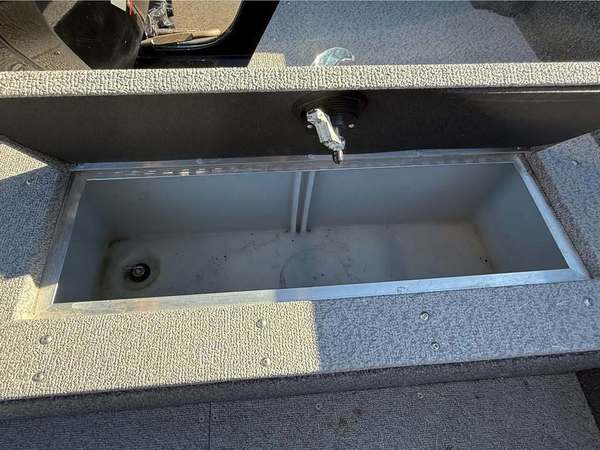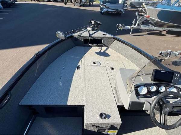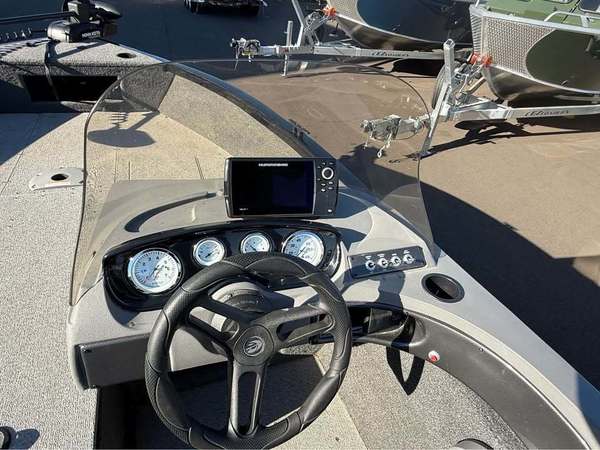 Features include MinnKota Powerdrive trolling motor, Helix 7 on dash, center in floor rod storage, stern livewell, and battery charger.