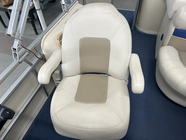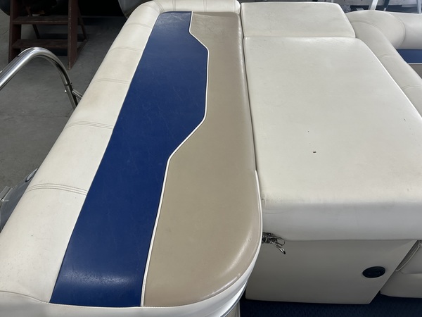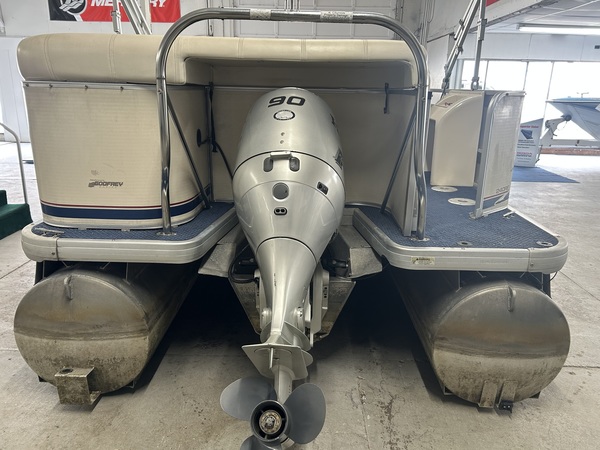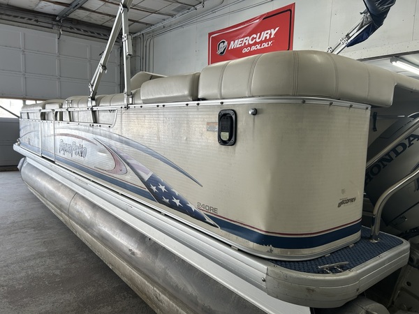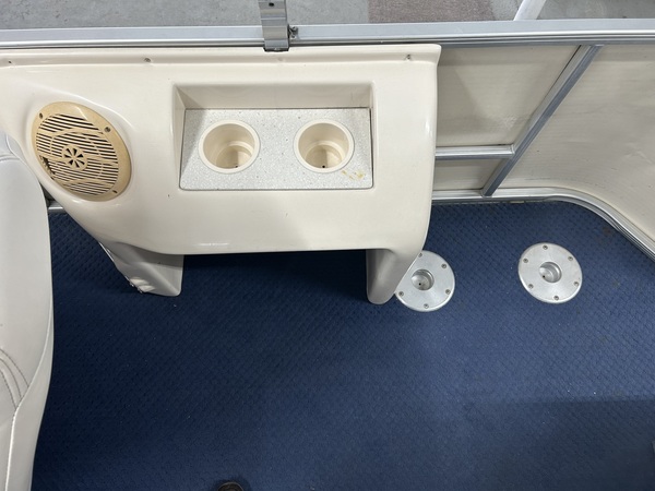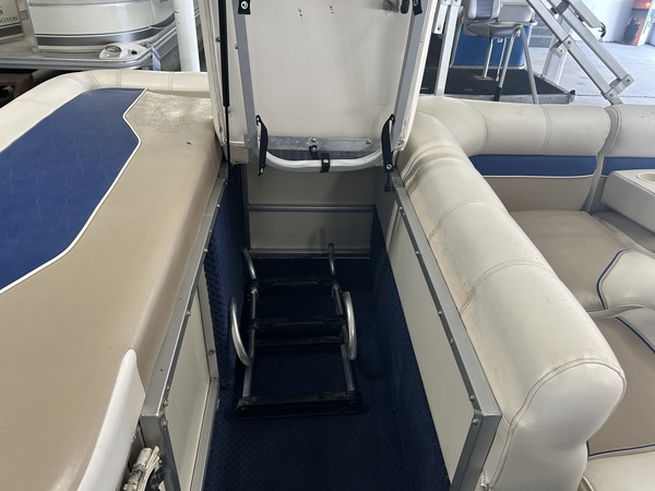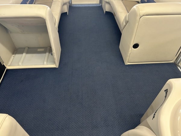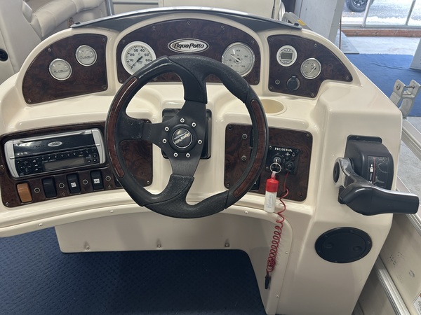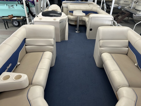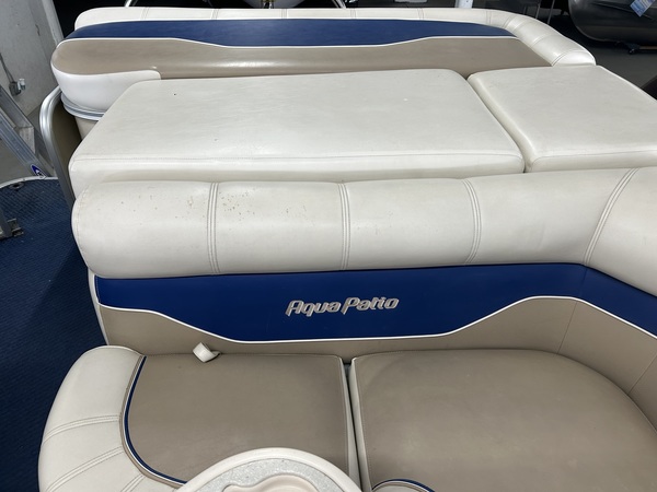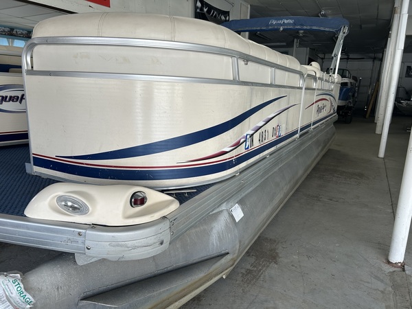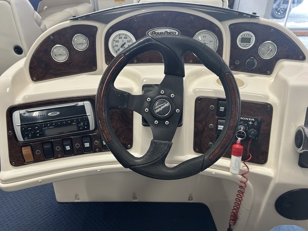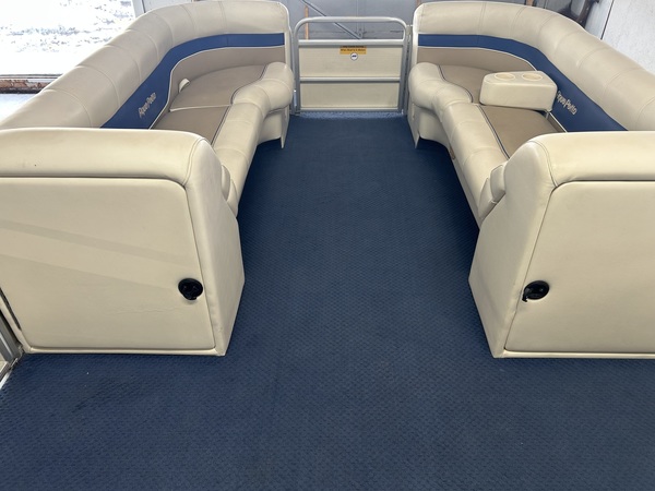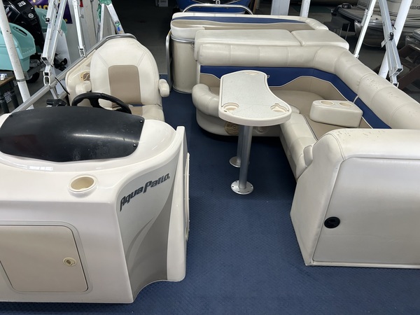 Grab 14 of your friends for a fun filled day on the water! This 2004 Aqua Patio with a 90 HP Honda 4 Stroke motor still has a lot of life left in her and ready to go. Both the boat and motor have been inspected and operate as they should. The features and accessories include 2 - 25" pontoons, external gas fill, 4 entry doors, blue carpeted flooring, bimini top with boot, docking lights, ski tow bar, 1 rear stowable boarding ladder, RPM/MPH, fuel, volt, trim and depth gauges, Clarion stereo with 4 speakers, CD player, Bluetooth and Sirius ready, lots of storage, 2 portable cupholders and cupholder throughout, navigation lights, stainless steel cleats, fire extinguisher, horn, 12V receptacle on helm, low profile windscreen, table with two pedestal locations on the boat, and a snap-on cover.