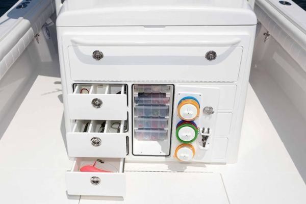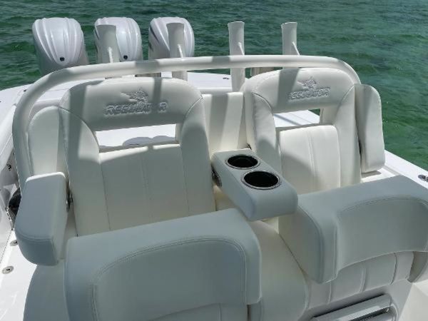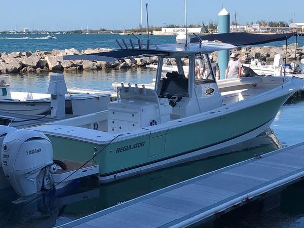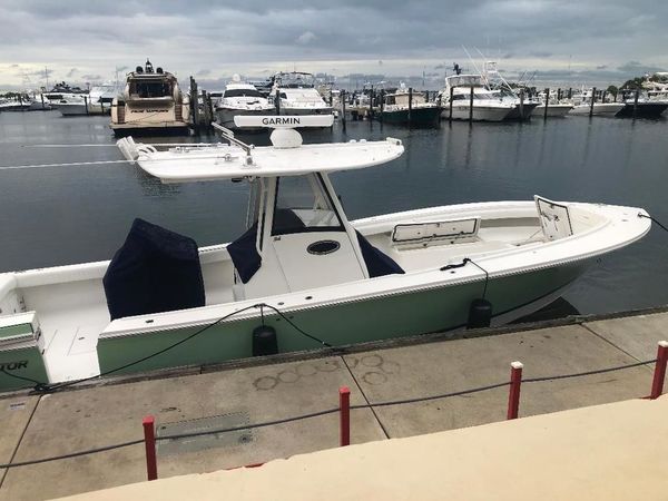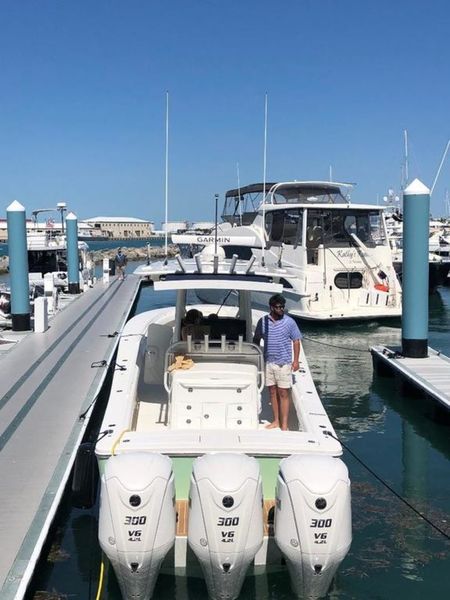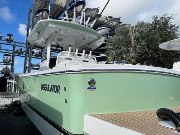 Powered by Triple White Yamaha 300's with only 825 Hours, Helm Master EX joystick system, SEA KEEPER 2 , AIR CONDITIONING, Custom "Pastel Green " Hull with Navy blue boot stripe, Rear Sunshade, Forward Sun Shade, New style T-Top with integrated windshield, Optimus Power steering, Garmin Offshore Package w/ auto pilot, Garmin Fantom 124 radar Upgrade, LED multi colored under water lights, NEW STARLINK 2025 and much more !!