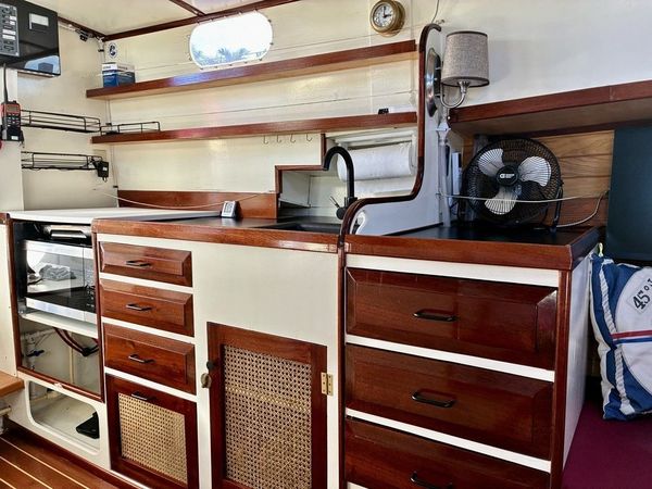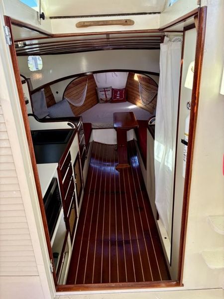 The interior finished in the Herreshoff style of white bulkheads, cabin sides, overhead and joinery accented by varnished mahogany trim and drawer faces.