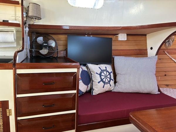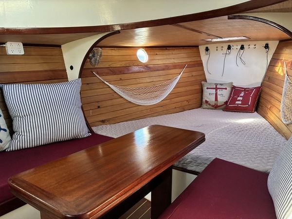 Continuing forward is main saloon with settee seating port and starboard and drop-leaf table to starboard. Starboard settee can be used as a single berthing space.