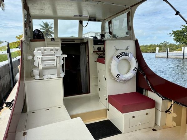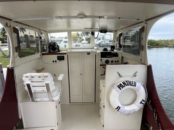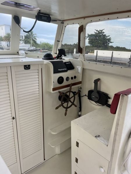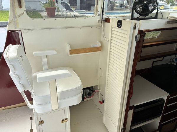 Interior entered by way of companionway door from pilot house. Private head compartment to starboard.