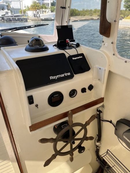 lcom IC-M330 VHF radio GPS and emergency transmitter. Cell phone and tablet docking stations at helm.