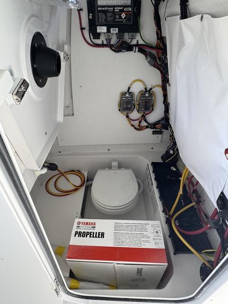 On-Board Amenities: Porcelain head with overboard discharge, slide-out YETI cooler track, and raw/freshwater washdowns.
