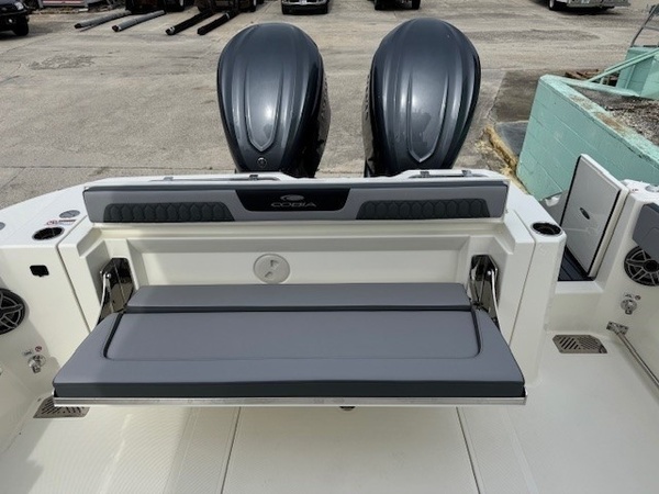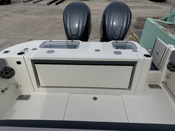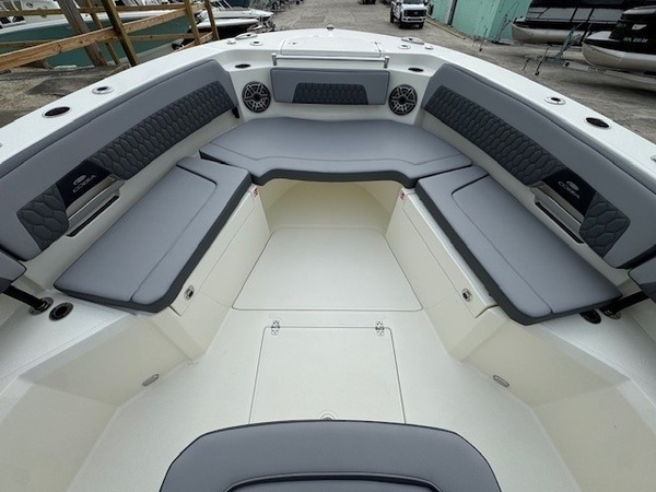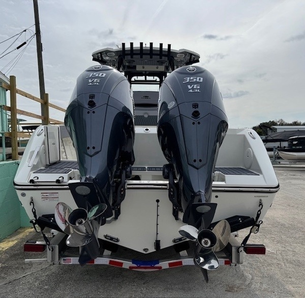 Cushions (Platinum & Storm) upgradeConsole Insert (Haze Grey) upgradeBoot Stripe (Haze Grey) upgradeYamaha Twin F350XSA (Grey) 700HPHelm Master, EX DES Twin Engine W AP/JOY/ISO ChargerDigital Electric SteeringGEM Stainless SteelSeakeeper RideSeakeeper Ride IndicatorBow Cushion Pkg Cool TouchFaux Teak Decking Kit, Grey and BlackHardtop with Integrated Frame and Glass Windshield, Matte Black Powder CoatingSun Shade, BowStereo, JL Audio with Amp and Speakers, 4 BlackSpeakers, JL Audio for Hard Top, 4 BlackBoarding LadderCockpit Toe RailDeep Drop Set-Up (Reinforced Gunnel Boards and Electric Reel Outlets)Kingfish Rod Holders (1 Port, 1 Stbd), Hard TopFlush-Mount Kite Rod Holder (4)Outriggers for Hardtop (GEM)VHF 215 Radio-Hard-Top LocationWindlass Deluxe - Chain, Rope, S/S Anchor and Stem Chafing GuardFresh Water Washdown for WindlassWired Remote At Bow for Windlass SystemTrolling Motor PrepBattery Charger (4-Bank with Inlet)Under Water Lights, Blue (Set of 2)Battery, 31 Series (Qty 4)Garmin Dual GPS 1643 XSV w/ Acrylic DashBoaters Exchange Discount "Yamaha Twin F300XSB (Grey)Helm Master, EX DES Twin Engine W/ISO ChargerGEM Stainless SteelTrim TabsTrim Tab IndicatorYamaha Fuel/Water Separator & Control CablesWaterproof Deutsch Electrical ConnectorsHull 2-Tone StandardHull Color - Hull 2-Tone Pure WhiteCushions - Cushion Color WhiteCushions - Cushion PackageBow Cushion PkgHideaway Aft Bench SeatingCockpit BolstersFaux Teak Decking Kit, Grey & BlackHardtop with Integrated Frame and Glass Windshield, White Powder CoatingStereo, JL Audio with Amp & Speakers, 4 WhiteSpeakers, JL Audio for Hard Top, 4 WhiteFresh Water Washdown SystemRaw Water WashdownElectronically Adjusted Forward Table/sun Lounge (Flushes Into Floor)Boarding Ladder (Covered)Forward Console Access DoorFresh Water at TransomFresh Water Sink in ConsoleBow Rail (Fully Recessed)Head Comfort Appointments (Towel Bar, Toilet Paper Holder, Mirror)Insulated Cooler in Console (57.5 qt)Tinted Port WindowSide Dive, Tuna and Dockside Boardingdoor (Inward Opening)USB Outlets