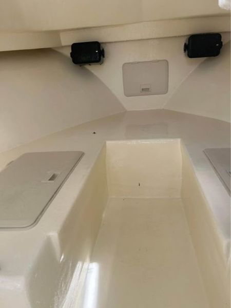 The forward cabin (68? long, 35? headroom? over bunk) w. storage, includes a new porta potty, cushions, headliner, screens, privacy curtain and anchor locker door.