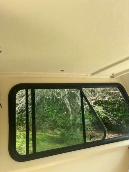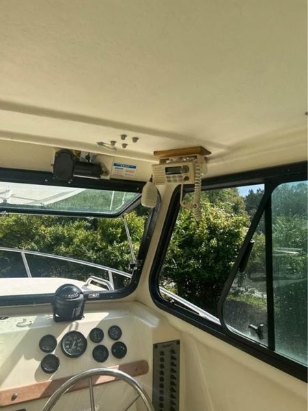 The pilothouse has retractable side windows with screens and the front windshields are fitted for outward opening. Twin captain chairs with cushions and pilothouse door.