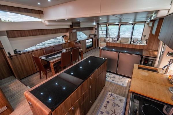 -Dining table for 6 -Island with storage and U-line ice maker -Aft of island is another counter -2 Sub-zeros Summit wine cooler -De Dietrich 4 burner cooktop -Samsung microwave convection -Abundance of cabinet storage -Port side hatch door -Cutting board -2 bar stools