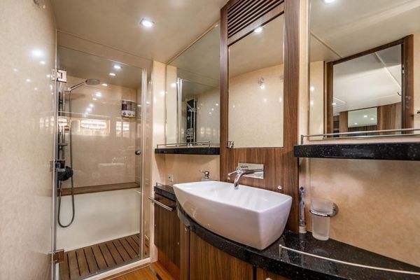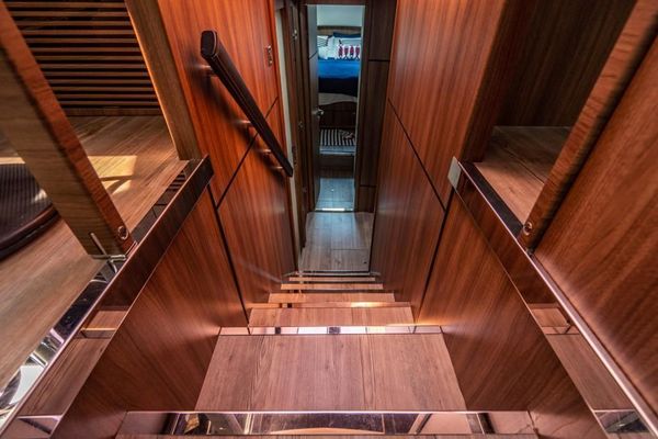 -Teak swim platform -Swim ladder -Access to crew room -Shore power access -Stairs to cockpit on the starboard side