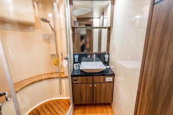 This vessel does not show like a 2007 model, it has been maintained at a high standard and the owner has done more upgrades than any yacht of her age. The Squadron 68 benefits from generous headroom, luxurious appointments and free standing furniture, not to mention a state of the art lower helm station which incorporates a central feature panel finished in stitched leather to contrast the innovative, hard-wearing flooring at the helm, galley and breakfast bar.