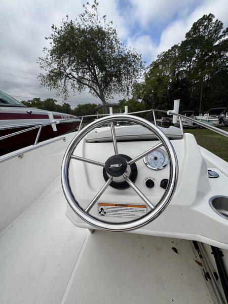 -User-Friendly Helm: Features a side-console station with a stainless steel steering wheel, dual drink holders, and an ergonomic layout.