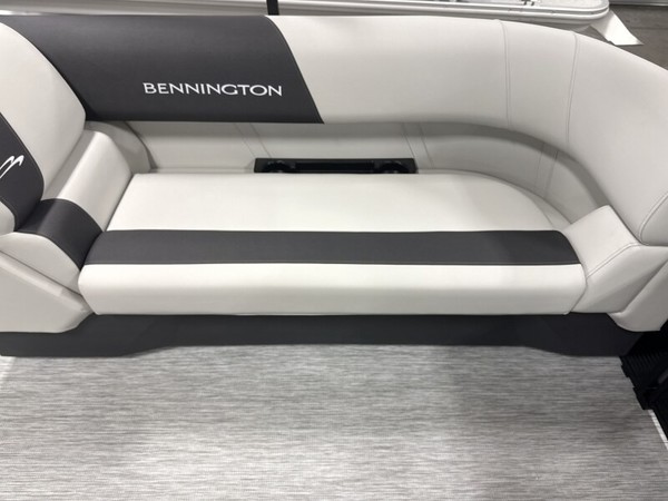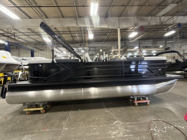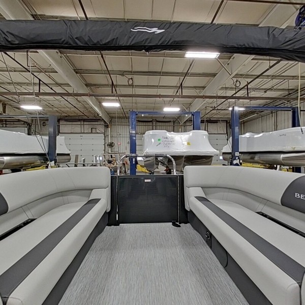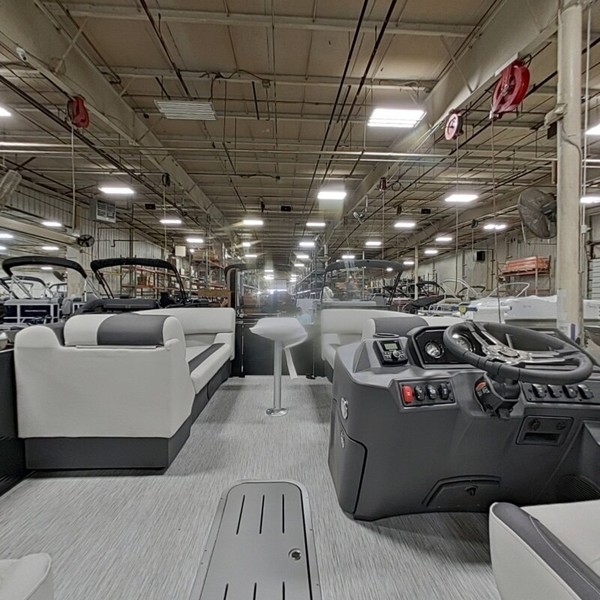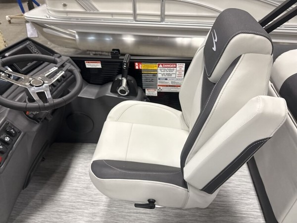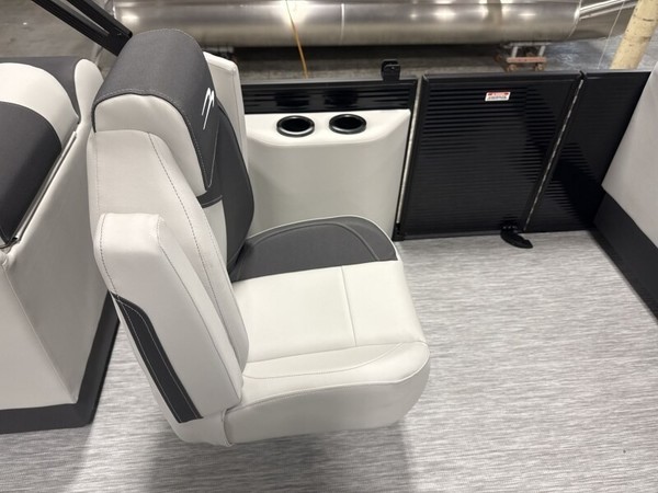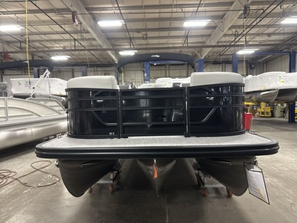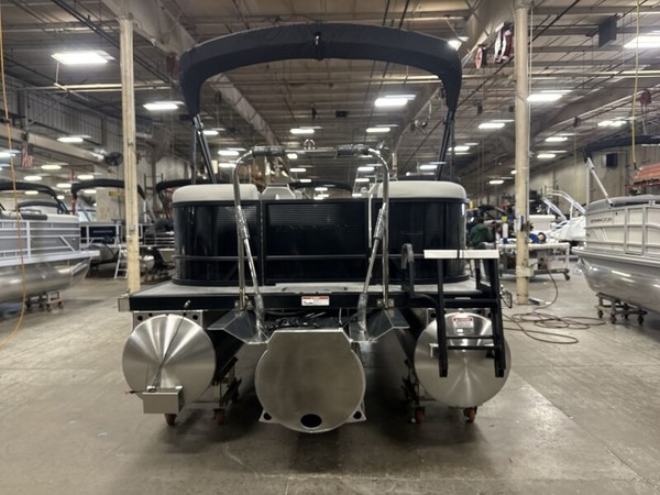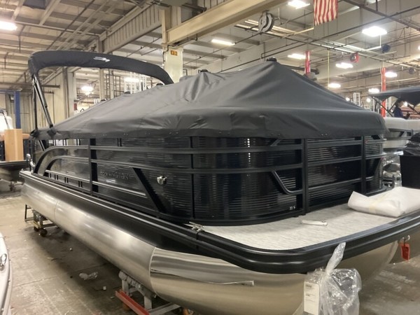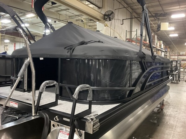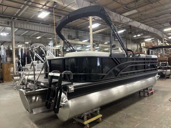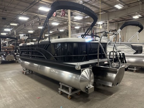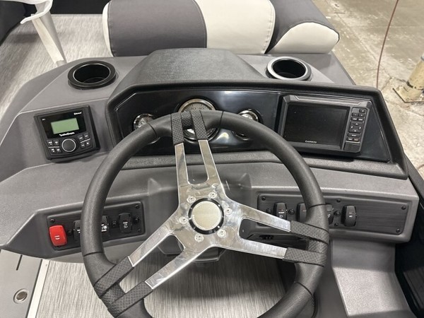 The features and accessories on this tri-toon include 3 pontoon tubes, SeaStar Hydraulic Steering with tilt, SPS Performance Package, Black Out Luxe Anodized railing, 33-Gallon fuel tank with external fill, extruded splash guards, underdeck spray deflectors, Dimensional brushed logos, LED docking lights, heavy duty rub rail with black insert, Bimini top with boot, Shoreline Woven vinyl flooring - Impulse Mineral Grey, standard aft deck, in-floor storage, Garmin Echomap Chartplotter, analog gauges, ski tow bar, console wireless charging, standard trim package, Serene soft touch vinyl with Simtex accents, Captain's air recliner, Co-Captain's air recliner, Ironwood accents, rectangular table (stowable), Rotomold console with LED courtesy light, black steering wheel with chrome accents, horn, Rockford Fosgate PMX-1 stereo with 4 speakers, single battery switch, 12V receptacle, USB Port (Type A & C), 3 chaise lounges, 4 step ladder, standard black drink holders, soft sided bag cooler, lighted gate glides, fire extinguisher, waste container, stainless-steel cleats, LED navigational lights, and EZ Clip mooring cover. Engine HP: 50 bhp; 37.3 kW Engine Displacement: 60.8 cu. in. (996 cc) Deck Length: 275.5 in. (7000 mm) Deck Width: 102 in. (2.6 m) Number of Tubes: 2 Fuel Capacity: 25 gal. (94.6 L)