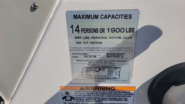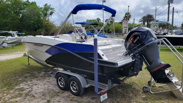 2022 Starcraft SVX231, Yamaha Vmax SHO 250hp 4-stroke, & Road King tandem axle trailer. This rig comes with the following added options: Simrad 7? GPS, JL Audio w. speakers, bimini top, boat cover, bow boarding ladder, freshwater washdown, stainless steel prop, porta potti area and sink.