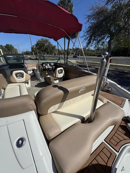 The Crownline E21XS is the perfect crossover for families who want the sporty performance of a bowrider with the massive space and stability of a deck boat. Part of Crownline?s elite Eclipse Series, the E21XS is built on the patented F.A.S.T. Tab® hull design, which improves slow-speed stability, increases fuel efficiency, and ensures a smooth, dry ride even when the afternoon chop picks up on the Gulf.