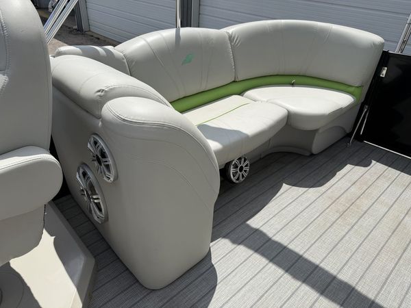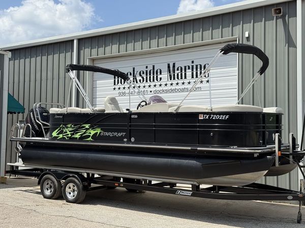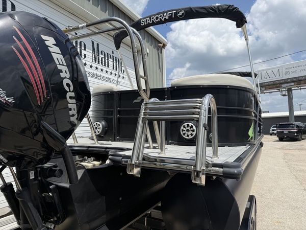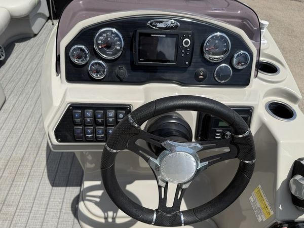The Stardeck SLS3 pontoon boat by Starcraft offers plenty of details to impress with a standard third tube with HMX Performance Strakes, full fiberglass console, sea weave rear deck, sporty gray furniture and a seating configuration that keeps everyone in the action.