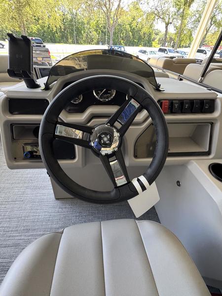 Modern Helm Console: Features clear bezel gauges, a sporty tilt steering wheel, and a protective windscreen.
